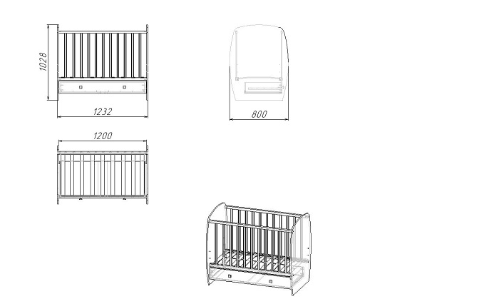 Размеры кроватки (ВхШхГ) – 1028х1232х800 мм.