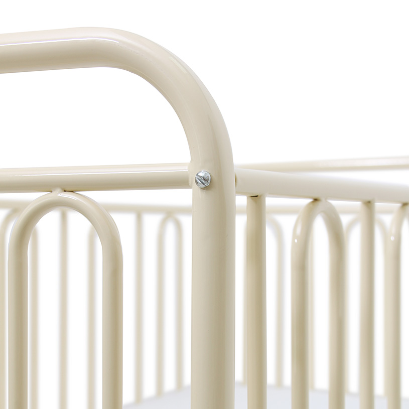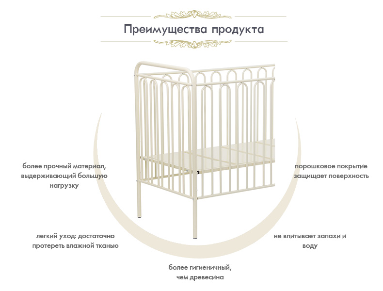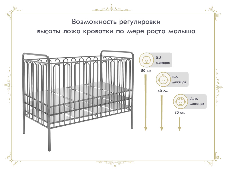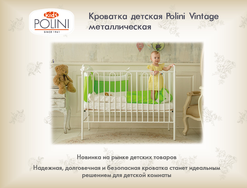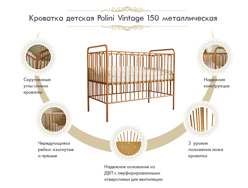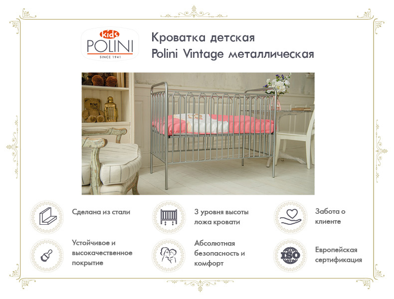 Кровать Polini kids Vintage 110 (Полини кидс винтаж 110) - детская металлическая кроватка для ребенка с рождения до 3-4 лет. Кровать выполнена из стали. Невзирая на то, что любой металл вызывает ассоциацию чего-то тяжеловесного, детские кованые кроватки не принуждают к таким сравнениям, а заставляют только восхищаться. Они легкие, красивые, с яркими или классическими расцветками. Такая кроватка станет украшение любой детской комнаты. Для удобства родителей высота спального ложа регулируется в трех положениях. Все углы закруглены для безопасности ребенка.