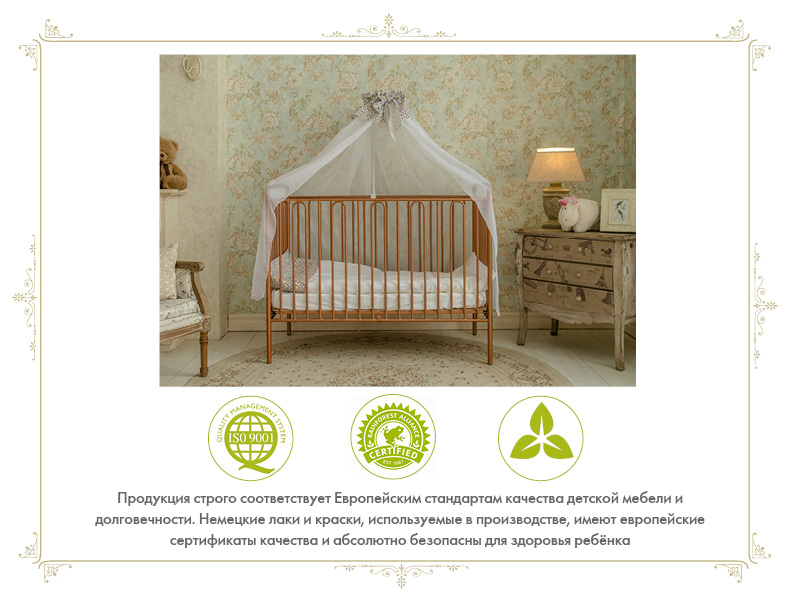 Продукция строго соответствует европейским стандартам качества детской мебели и долговечности. Немецкие лаки и краски используемые в производстве имеют Европейские сертификаты качества и абсолютно безопасно для здоровья ребенка.