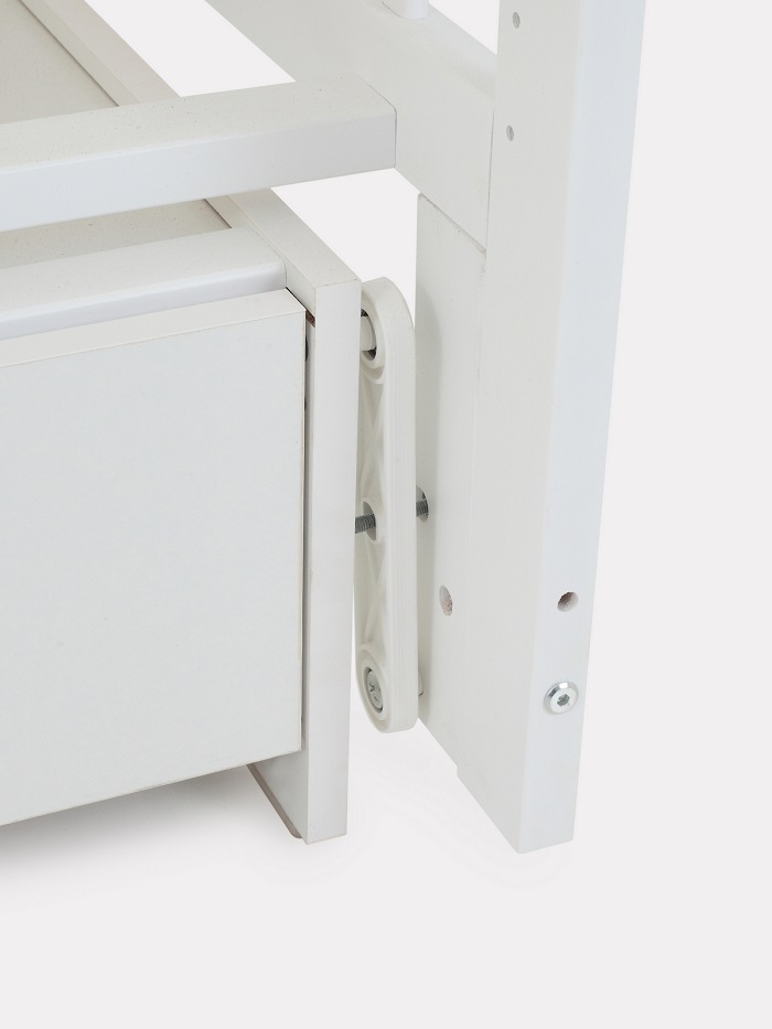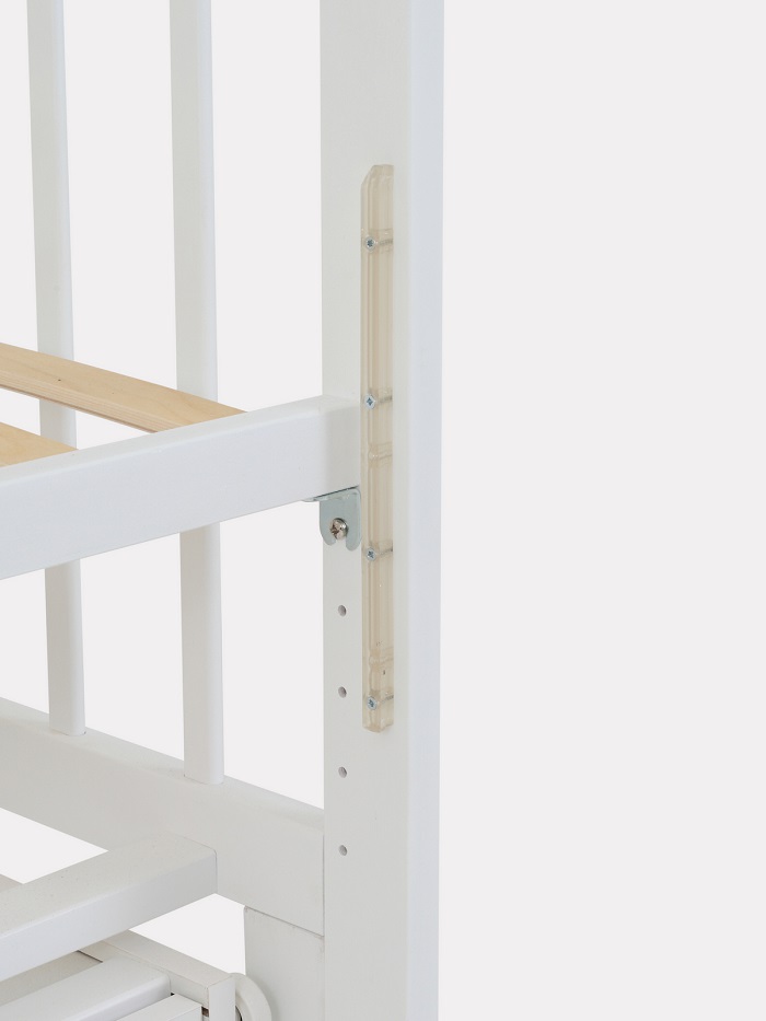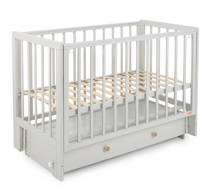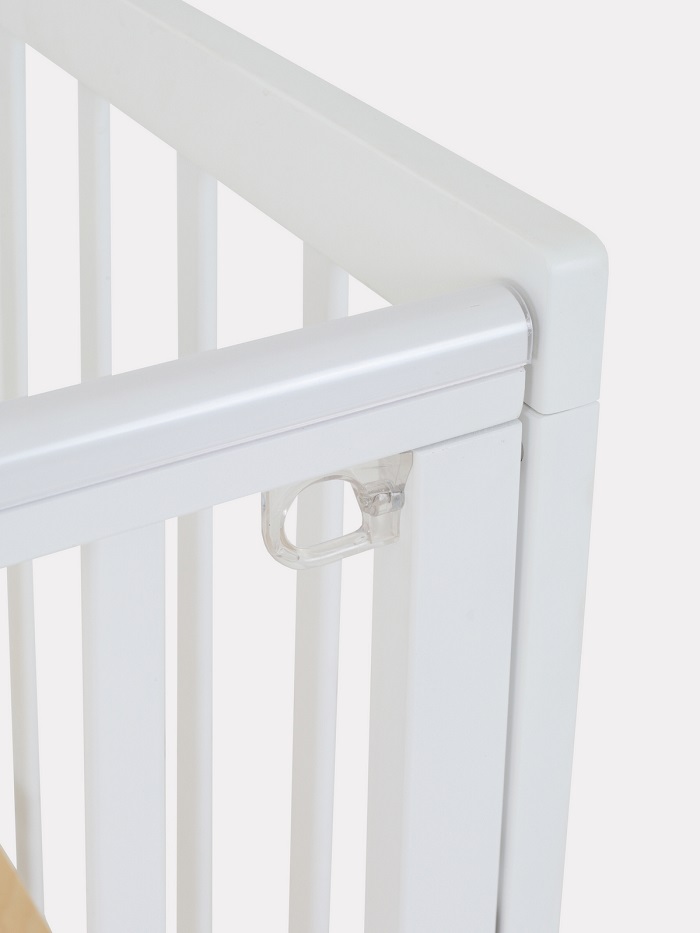 Передний бортик оснащен курковым механизмом, который позволит быстро отрегулировать высоту бортика, или быстро его снять, превратив кроватку в приставную или диван. Так же бортик легко устанавливается на кроватку, без инструментов.