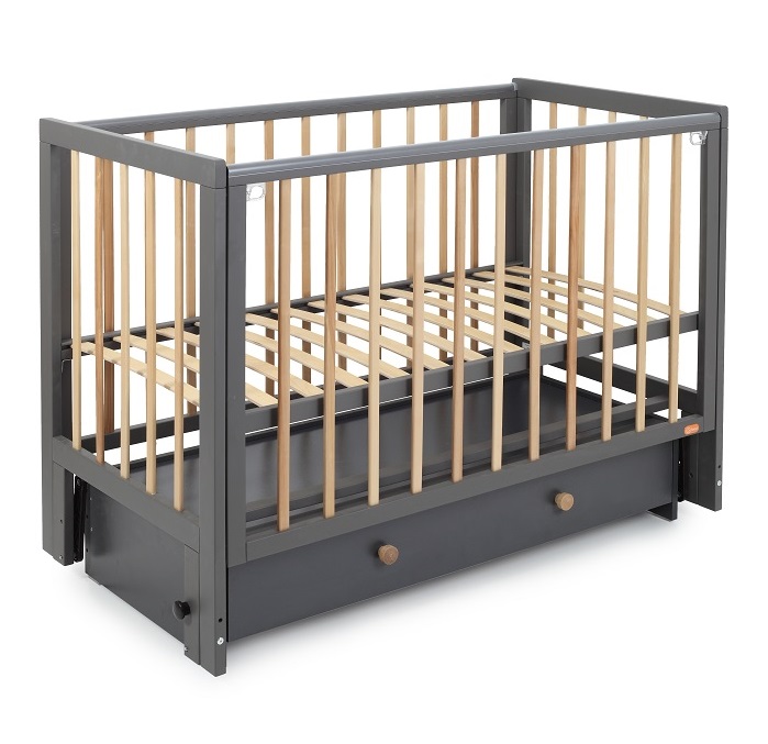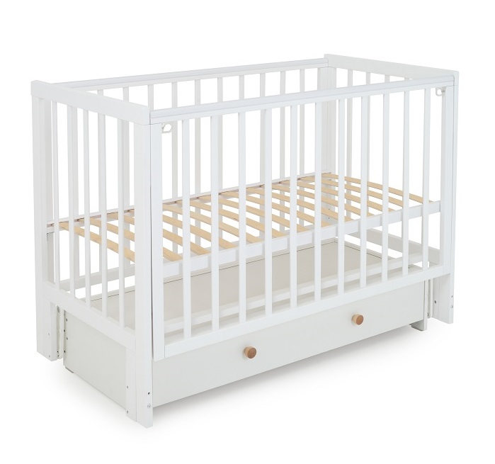 Большой ящик закрытого типа позволит маме удобно хранить объемные спальные принадлежности для малыша. Одеялки, бортики, пледы всегда будут под рукой, при этом будут защищены от пыли и не занимать много места в комнате. Удобные ручки их массива дерева стильно дополняют образ кроватки и удобны в использовании.