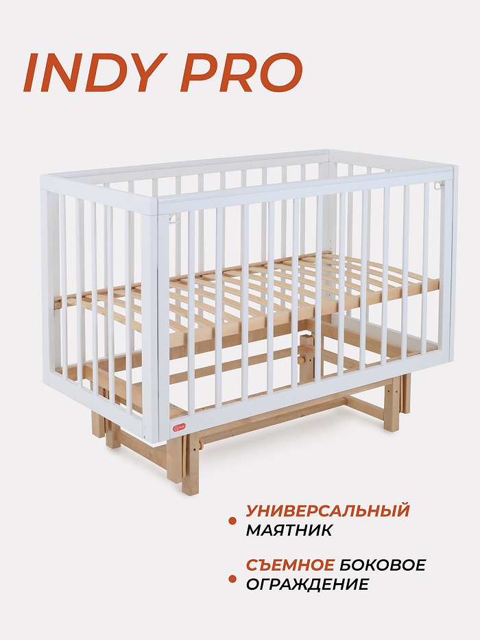 INDY PRO - отличается от своей популярной модели Indy универсальным маятником и автостенкой. Передняя стенка легко и быстро снимается с помощью курков и регулируется по высоте в двух положениях. Кроватку удобно использовать как приставную модель, ведь спинка снимается и ставится всего за пару движений. Так же большим преимуществом является универсальный маятник - он может качать кроватку вдоль или поперек в зависимости от сборки, что позволит родителям не выбирать тип качания, а пробовать и выбирать лучшее именно для вашего ребенка.