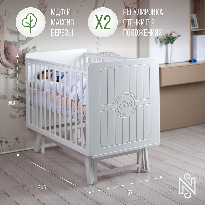 Кровать для новорожденного выполнена из массива березы и МДФ, а для ее покрытия использовалась безопасная для здоровья малыша краска. Чтобы малыш не мог пораниться об дерево во время прорезывания зубов, бортики оснащены силиконовыми накладками. Sweet Baby Nuovo может использоваться как приставная кровать или диванчик благодаря съемному бортику.