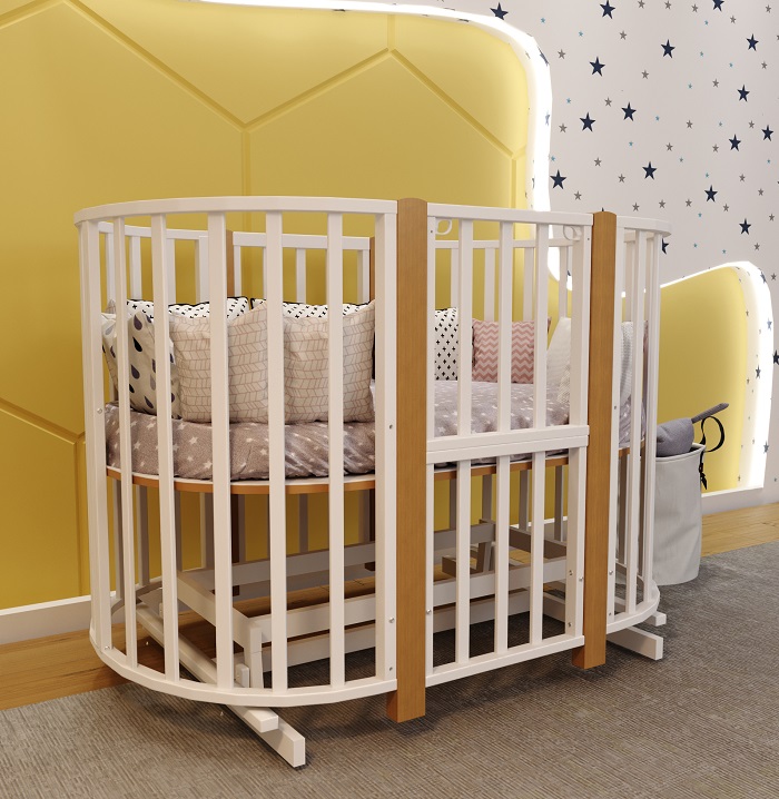 Сильвия 9 в 1 имеет много преимуществ. Например, она легкая и удобная для передвижения благодаря колесам. Она не имеет острых углов, что делает ее безопасной для детей. Кроме того, одна из стенок кроватки может быть использована в качестве автоспинки, что обеспечивает дополнительный комфорт и удобство родителям для быстрого доступа к малышу. Также благодаря съемной автоспинке круглую колыбель можно использовать, как приставную к родительской кровати.
