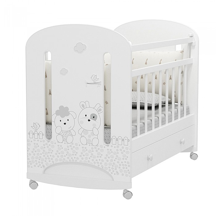 Детская кровать колесо качалка Альма Няня Fattoria Nuvola с ящиком - красивая кроватка с итальянским дизайном и удобным функционалом для ребенка с рождения до 3-4 лет. Кроватка выполнена из массива березы с использованием ЛДСП и МДФ. Кроватка имеет полозья для плавного покачивания ребенка из стороны в сторону. Так же на кроватку можно установить колеса для более легкого перемещения по комнате. Под кроваткой расположен вместительный удобный выдвижной ящик с шариковыми направляющими.