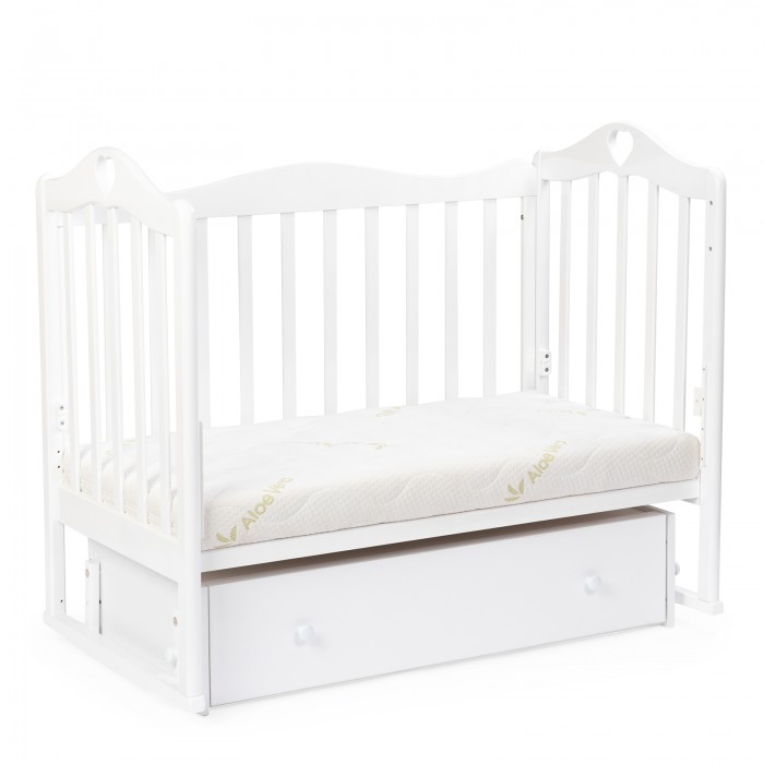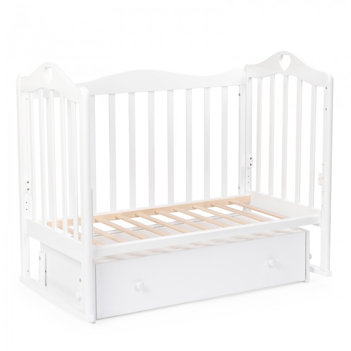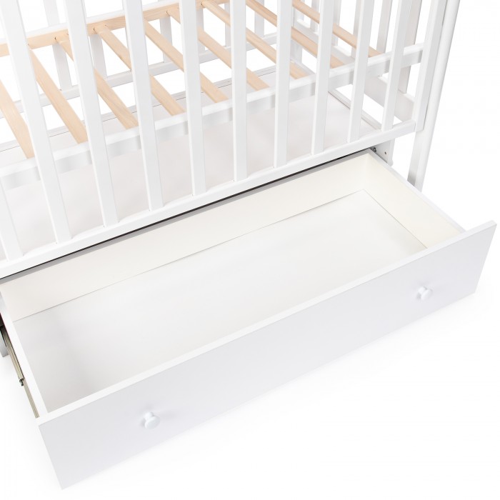Каркас кроватки выполнен из массива берёзы. Для удобства родителям, боковая стенка кроватки регулируется по высоте. Модель оборудована вместительным и практичным ящиком для хранения.