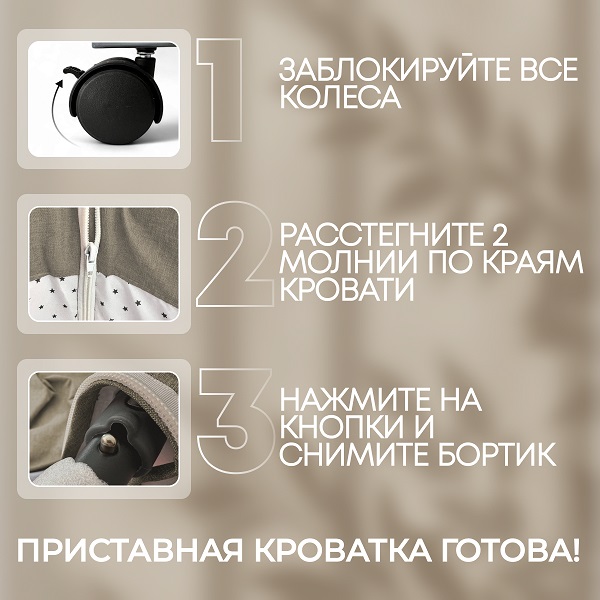В первые месяцы особенно важно, чтобы ребёнок чувствовал маму рядом. Функция приставной кроватки делает ночное кормление простым и удобным: мама всегда рядом, при этом малыш спит в своей отдельной зоне. Универсальная система крепления и два уровня регулировки высоты позволяют подстроить модель под любую родительскую кровать.