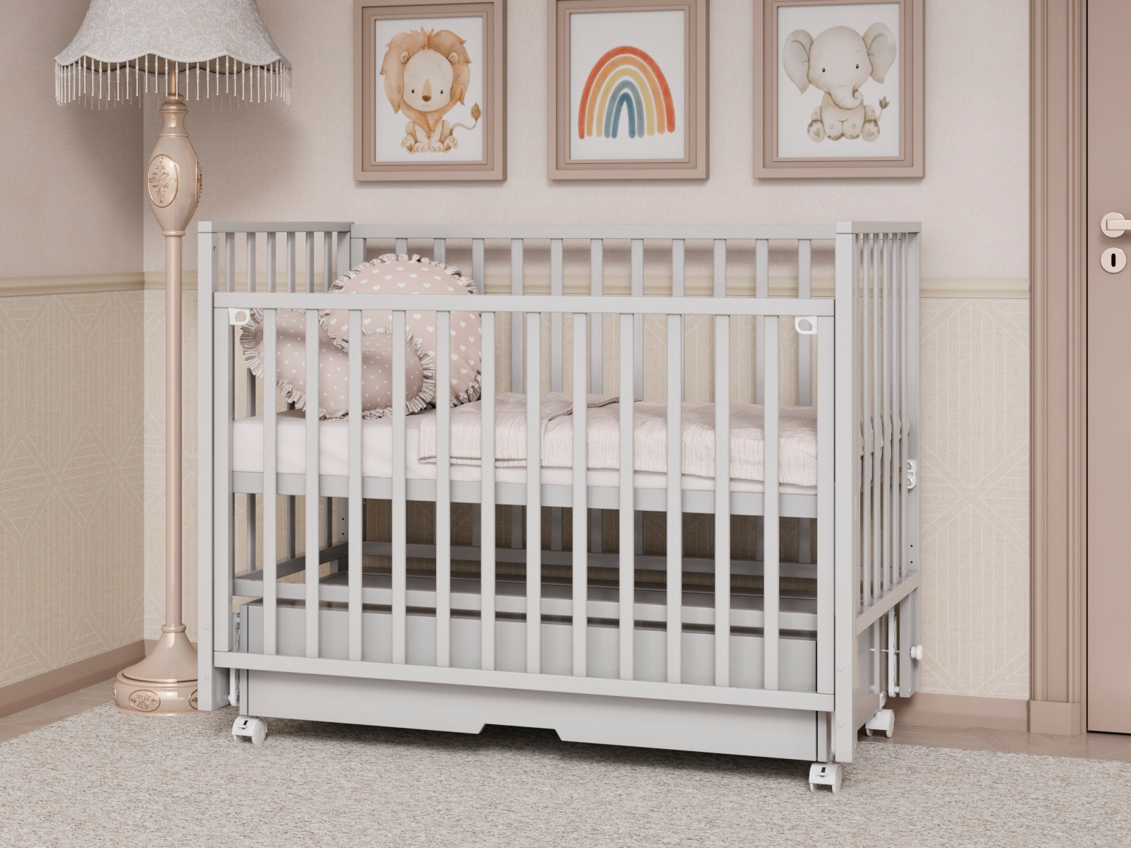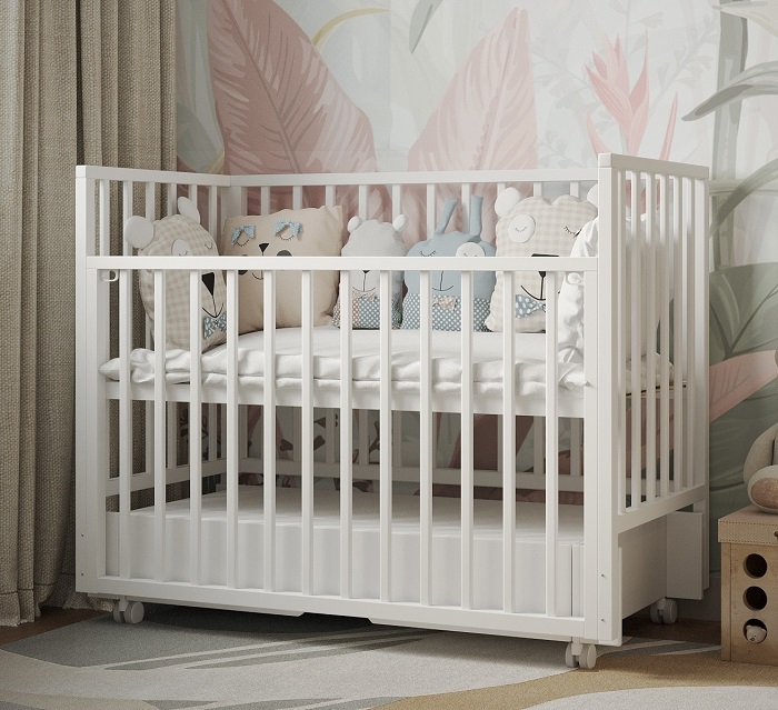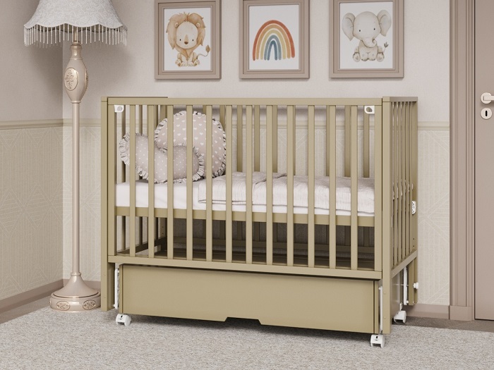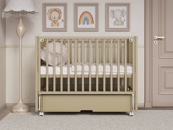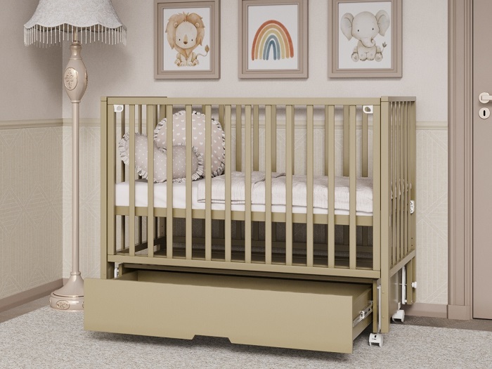 Вместительный ящик под кроваткой позволит удобно хранить детские вещи, например одеялки, пледики, бортики и тд. Ящик удобно выдвигается и задвигается, не тревожа сон ребенка.