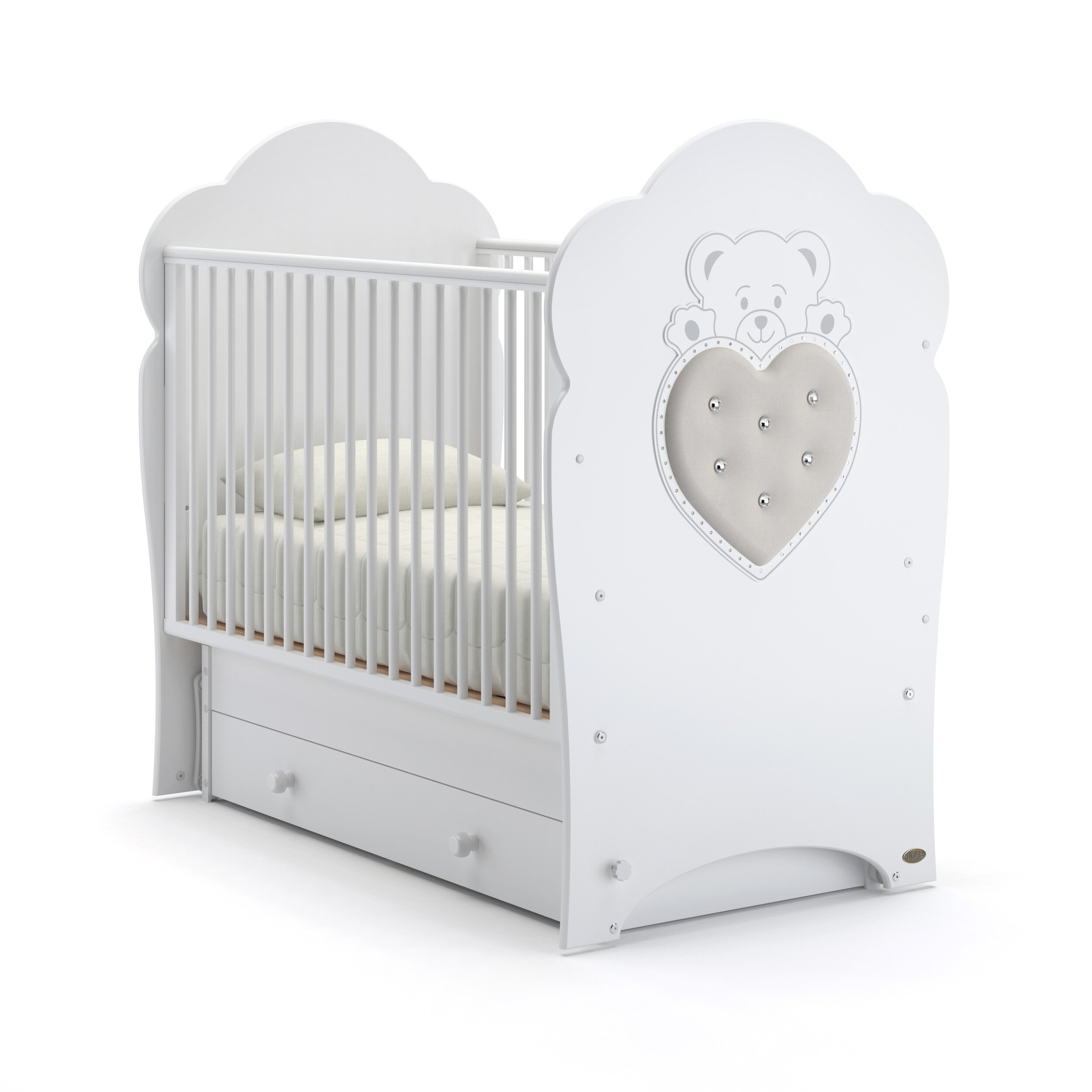 Детская кровать Nuovita Fortuna swing (нуовита фортуна свинг) - элегантная дизайнерская кроватка с 0 до 4 лет из бука. Кровать оснащена продольным маятником, для более легкого и простого укладывания ребенка. Спокойные и тихие покачивания, имитируют качание малыша в коляске и помогают малышу уснуть без маминых рук. Фигурные спинки украшены декоративными накладками в виде сердечка в руках милого медвежонка. Вместительный ящик позволит маме разместить все необходимые вещи для малыша.
