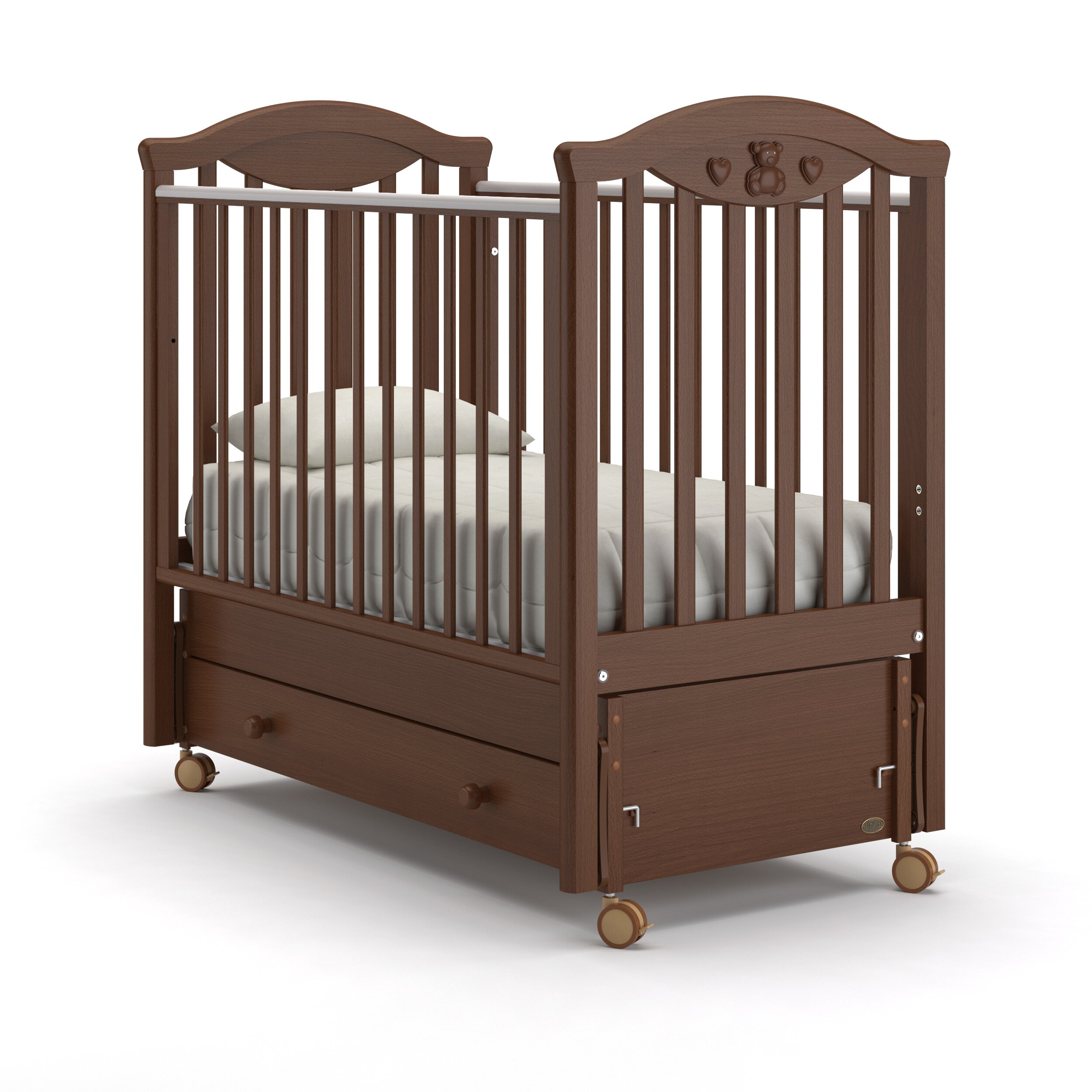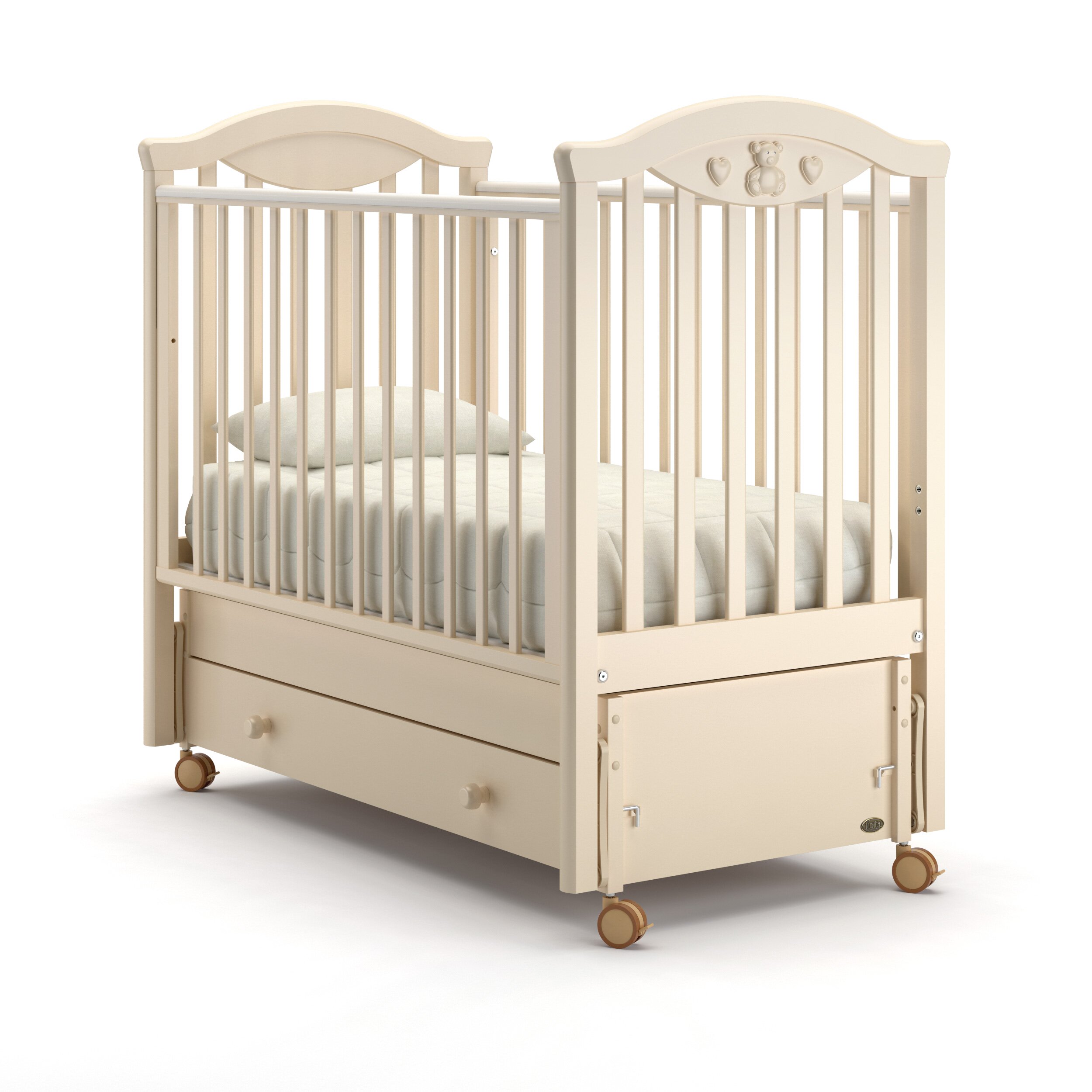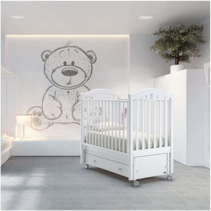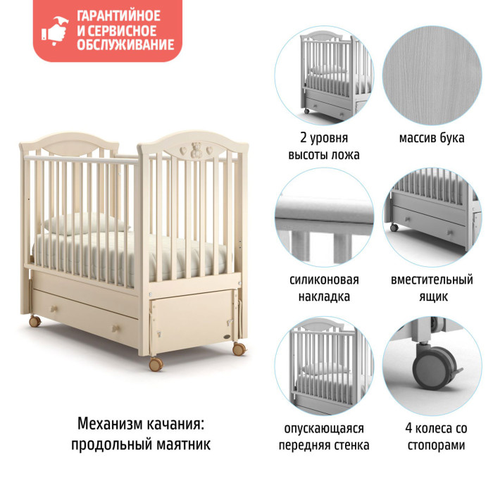 Кроватка изготовлена на современном оборудовании в соответствии с европейскими стандартами качества и под строгим контролем специалистов из Италии. Ее исполнение безупречно, а материалы натуральны и безопасны: корпус кроватки выполнен из знаменитого своей прочностью бука и покрыт экологически чистыми красками и лаками.