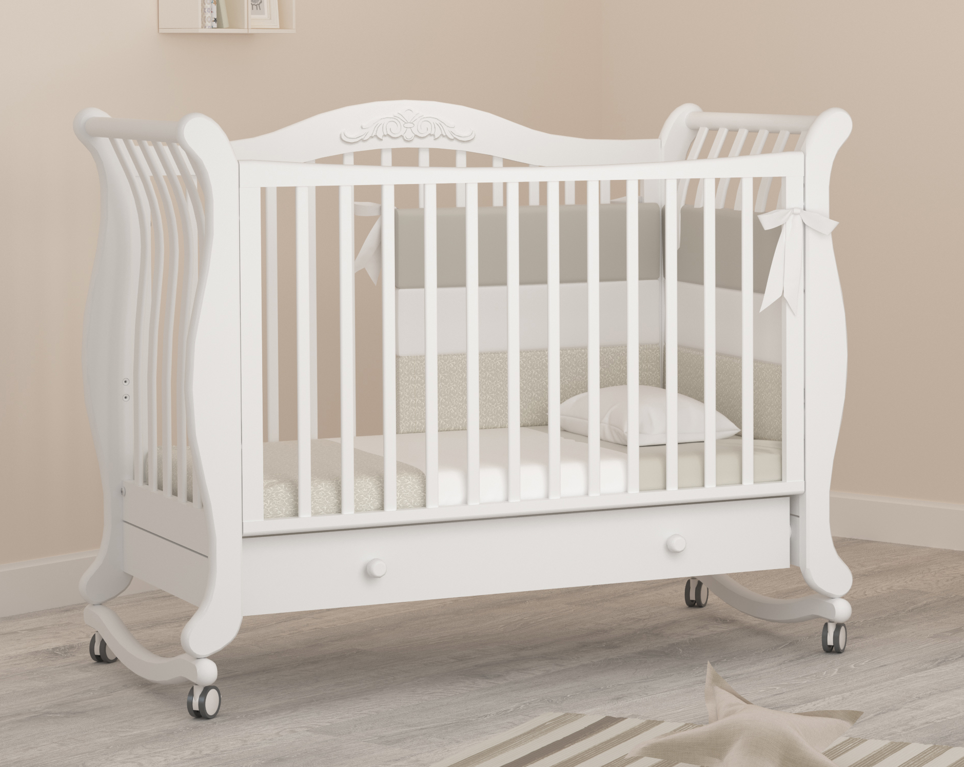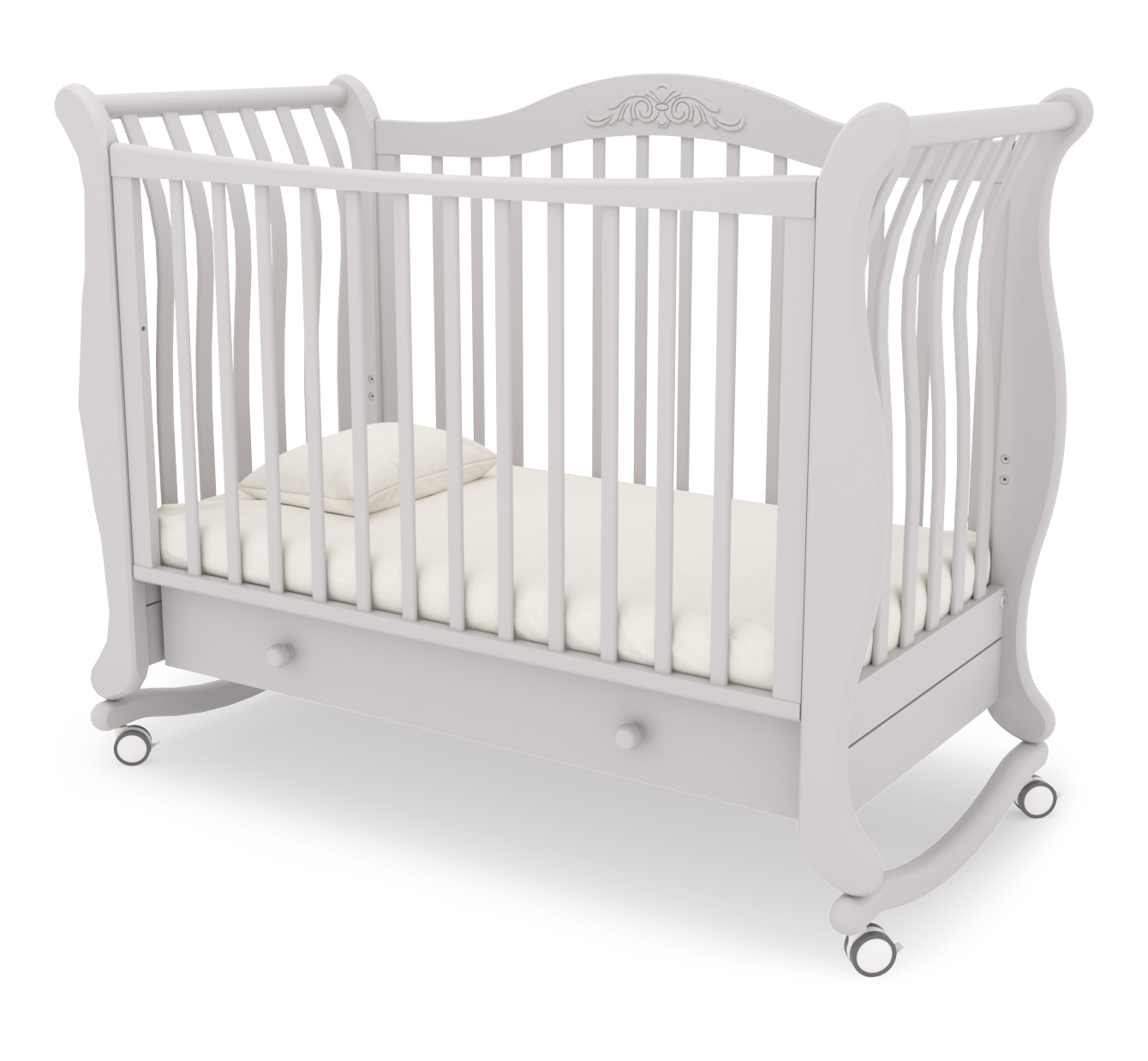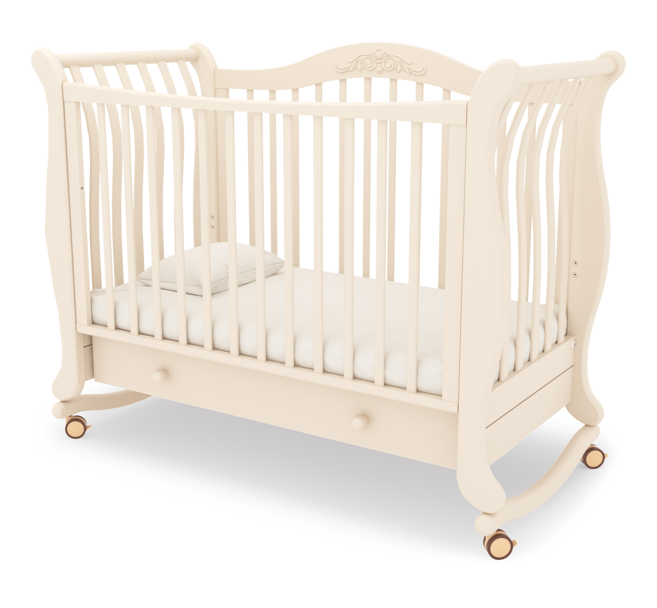 Гандылян Габриэлла (колесо-качалка, ящик) – красивая и элегантная кроватка-качалка для малышей до 3-х лет. Такая кроватка максимально обеспечит безопасность малыша, ведь в ней используются только качественные и натуральные материалы, в ней нет острых углов и опасных для малыша мест. Колыбелька раскачивается очень плавно и может быть задействована даже малышом. Но, правильно распределенный центр тяжести, не позволит кроватке перевернуться, поэтому вы можете не переживать за малыша. А когда колыбелька с полозьями станет не актуальной, на кроватку можно надеть колесики со стопорами.