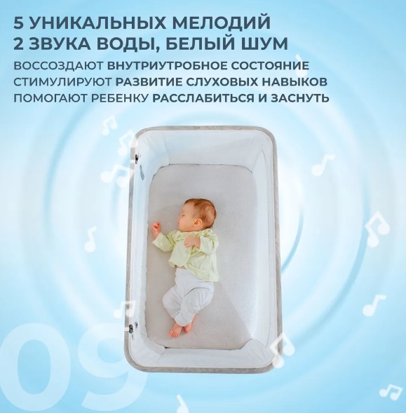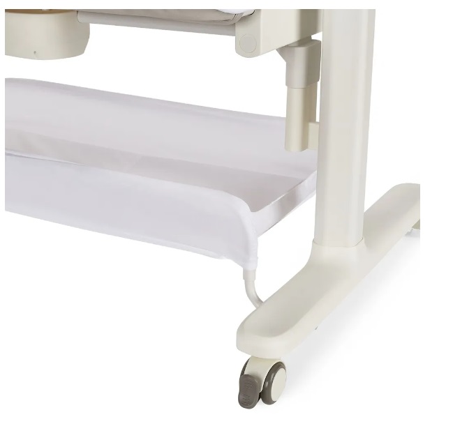 Колыбель для новорожденных Accanto Quadro также оснащена пятью мелодиями, двумя звуками воды и белым шумом, которые создают идеальную звуковую атмосферу для сна. Колыбель работает от сети и управляется с помощью пульта дистанционного управления, что обеспечивает дополнительное удобство. Поворотные колёса на 360 градусов делают её перемещение по дому лёгким и удобным.