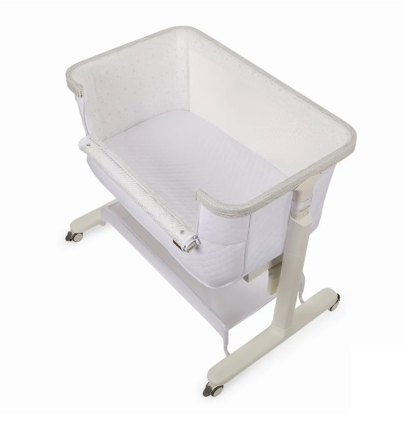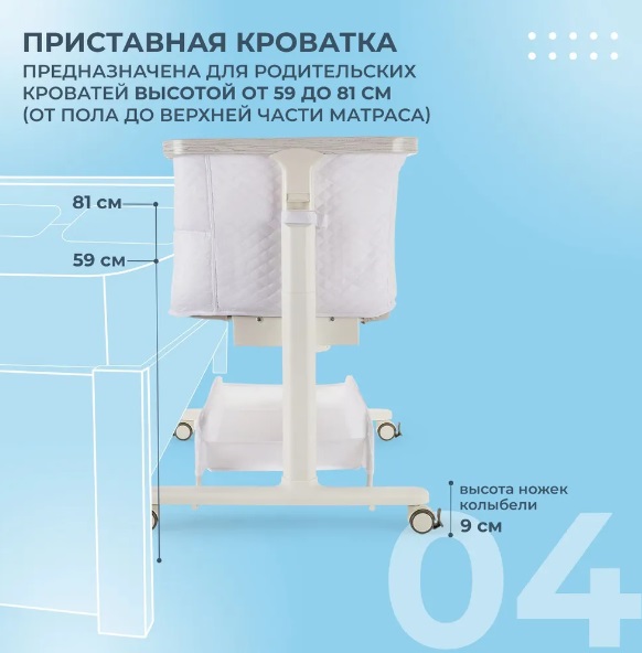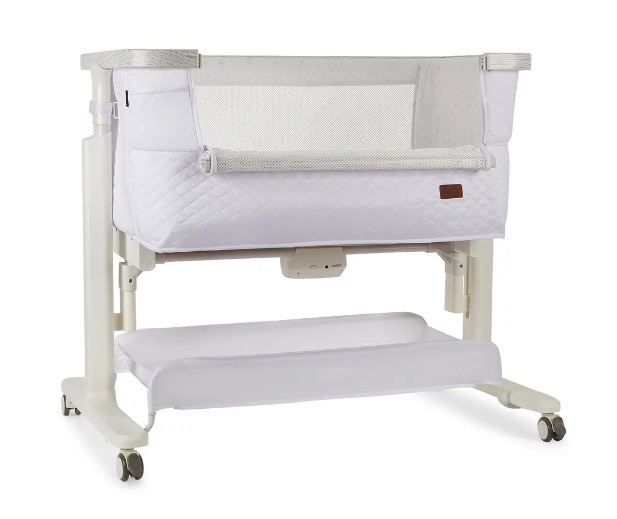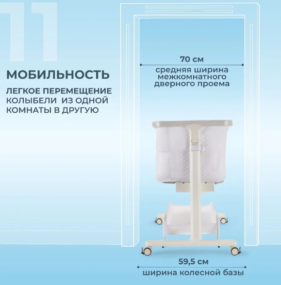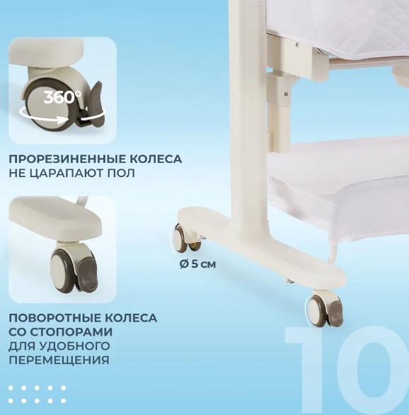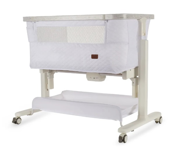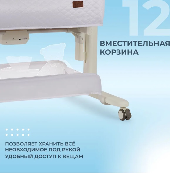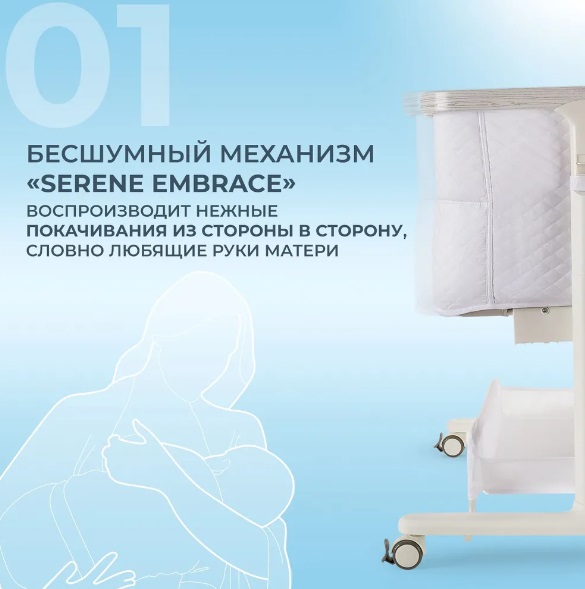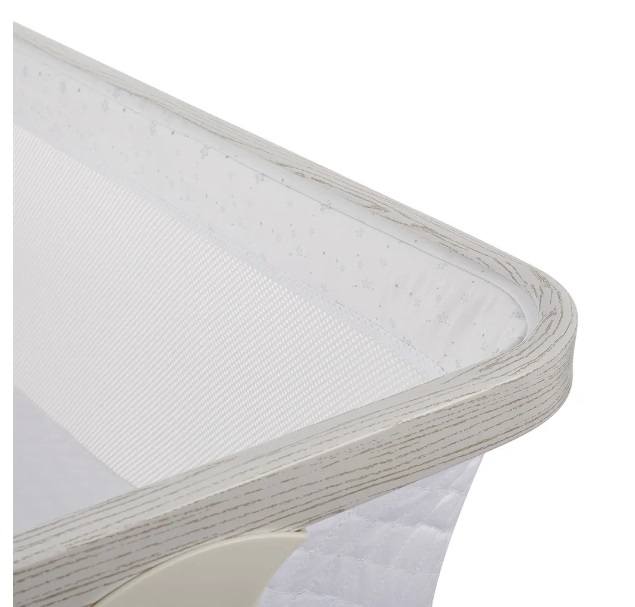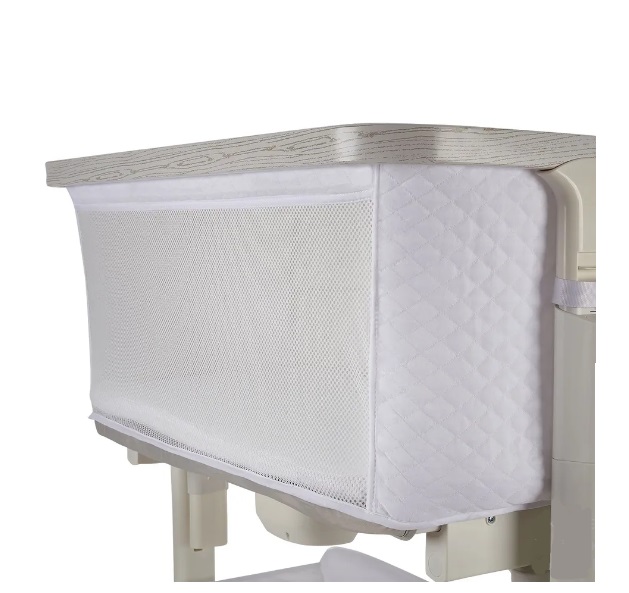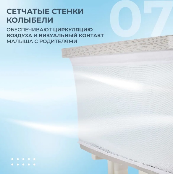 Сетчатые стенки колыбели обеспечивают естественную вентиляцию и поддерживают комфортный температурный режим, позволяя родителям легко наблюдать за малышом. Опускающаяся боковая стенка упрощает ночные кормления и наблюдение за ребёнком, делая каждую ночь спокойной и удобной.