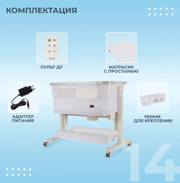 Комплектация: колыбель, матрасик с простынкой, пульт ДУ, адаптер питания, ремни для крепления к родительской кровати.