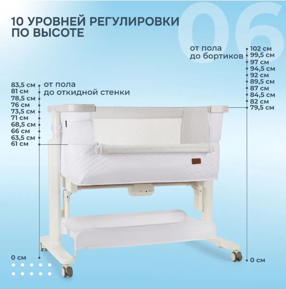 - Регулировка по высоте: 10 положений (от пола до бортиков: min – 80 см, max – 102 см), (от пола до опускающейся стенки: min – 61 см, max – 82см)