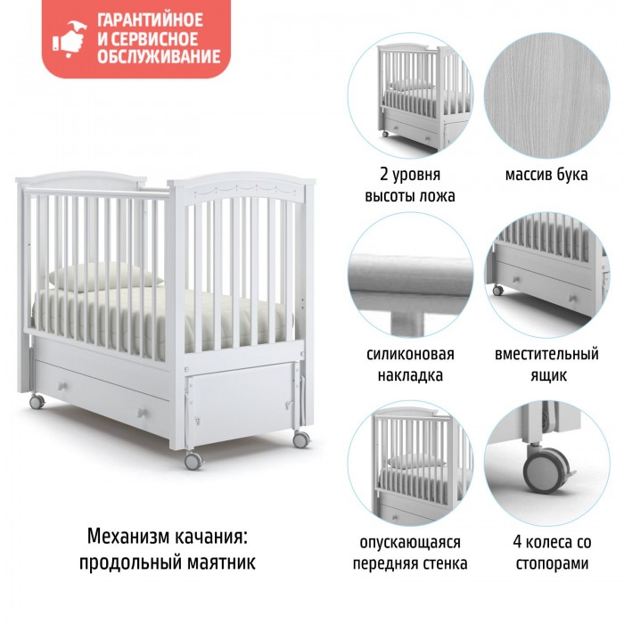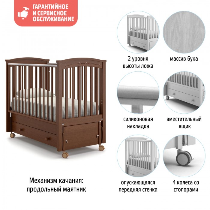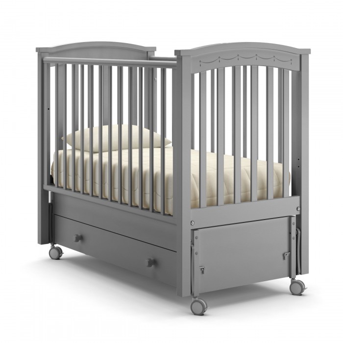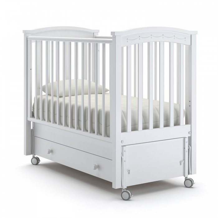 Кровать Nuovita Perla solo swing (Нуовита Перла Соло Свинг ) - кроватка из бука для ребенка с рождения до 3-4 лет с большим функционалом и итальянским дизайном. Кроватка отличается натуральными материалами и высоким качеством исполнения. Она станет удобным и безопасным местом для сна ребенка. Помимо стандартных регулировок переднего бортика и спального ложа, кровать оснащена маятником, колесами и удобным большим ящиком. Дно кроватки ортопедическое, реечное, что обеспечит комфортный сон и хорошую вентиляцию матрасика.