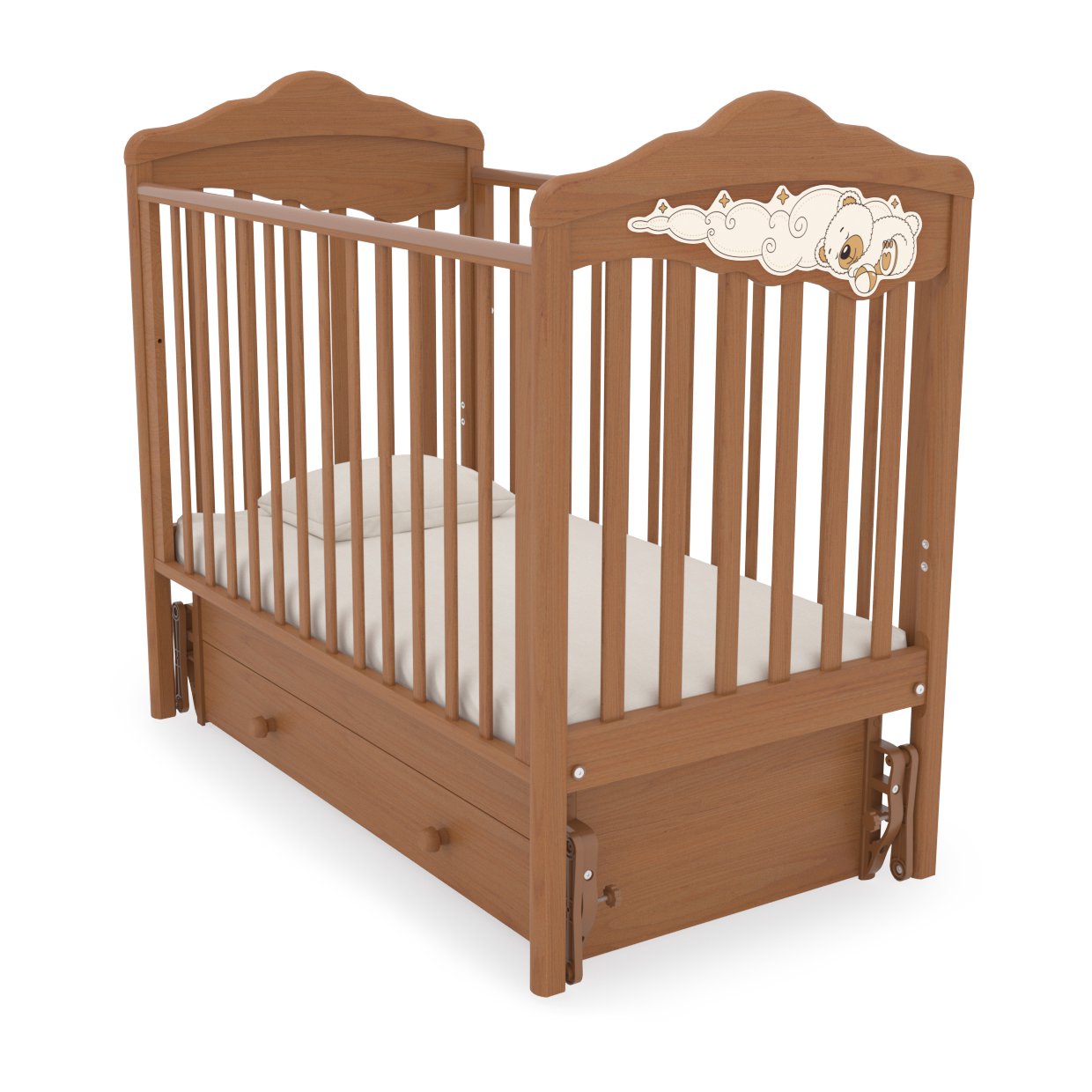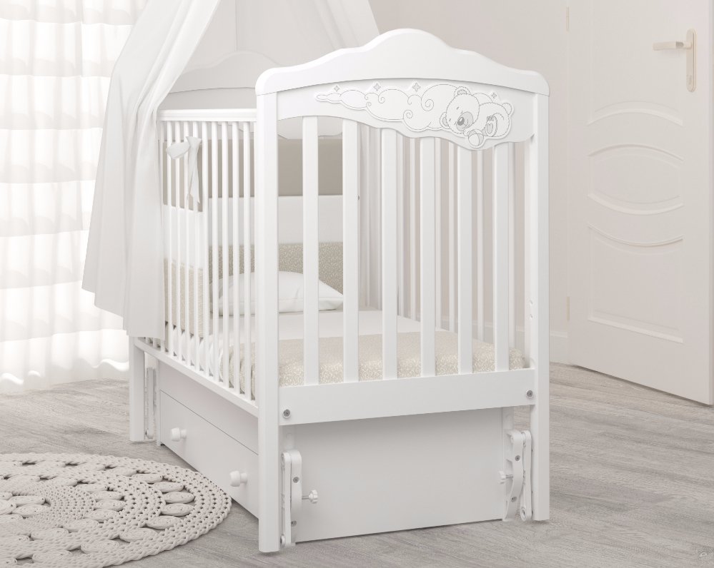 Модель представлена в классическом варианте со стандартным спальным местом 120х60 см . Это позволит без труда подобрать любой матрасик на ваш выбор. Для удобства родителей предусмотрены все необходимые регулировки высоты матрасика и бортика. Для плавного покачивания кровати с ребенком предусмотрен универсальный маятник. В зависимости от сборки маятник может быть продольным или поперечным. Маятник поможет ребенку быстрее уснуть в кроватке и сделать сон более спокойным.