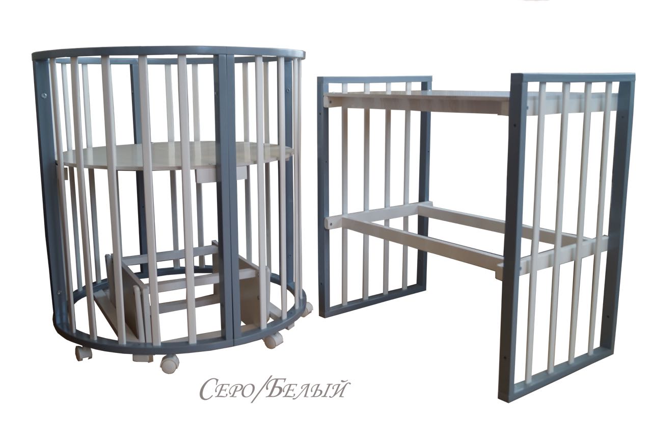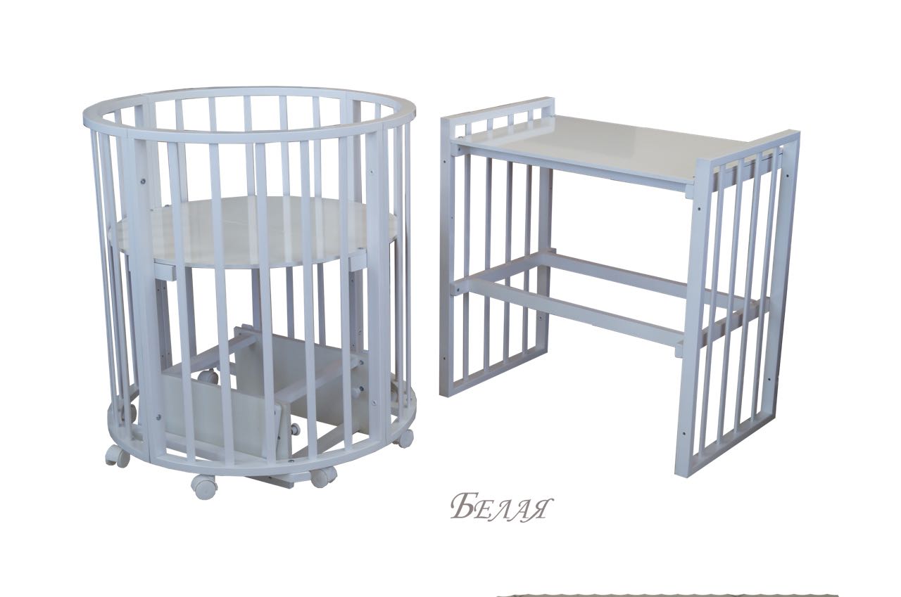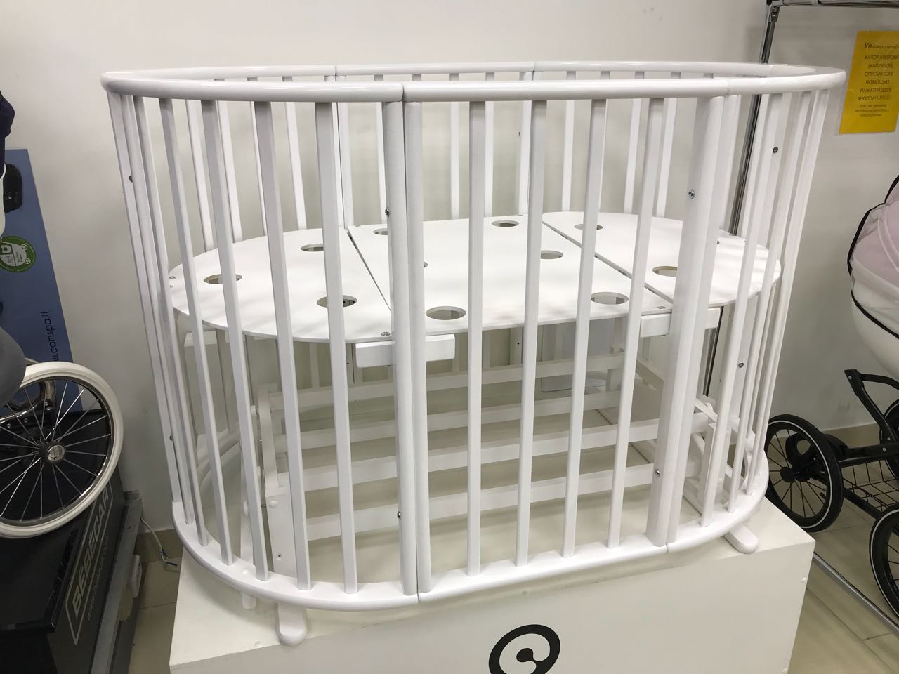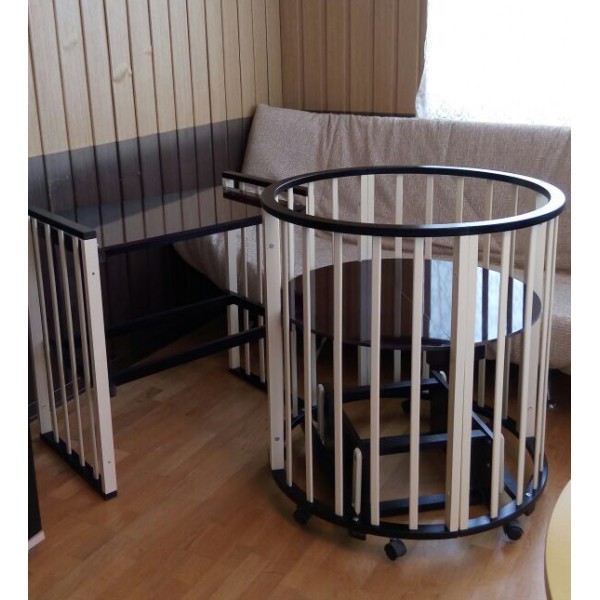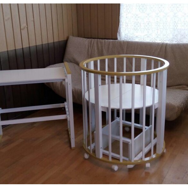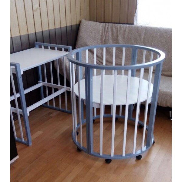 Детская кроватка «Лаура 6 в 1» легко трансформируется в колыбельку для новорожденных, пеленальный столик, овальную кроватку, манеж для игры и сна, стол + два стульчика, диван, приставная кроватка.