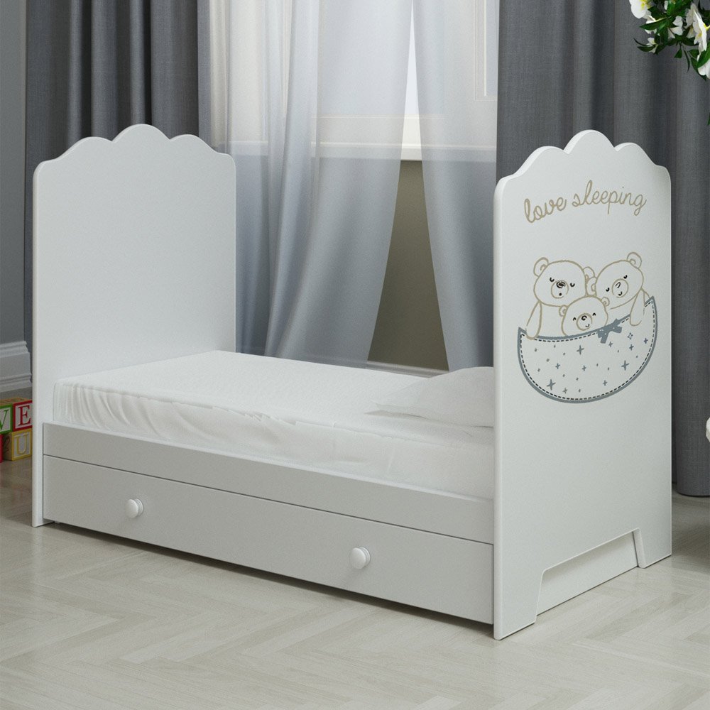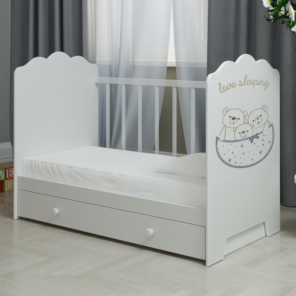 Ящик предусмотрительно закрыт сверху, чтобы защитить хранимые в нём вещи от пыли. Верхняя планка боковой стенки опускается вниз, чтобы доступ к малышу был простым и комфортным.