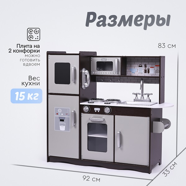 Деревянная кухня с аксессуарами: духовой шкаф с двумя полками для разных блюд и щелкающими переключателями, варочная поверхность с двумя конфорками, компактная раковина с вращающимися элементами, встроенный холодильник, шкафчик для хранения посуды, микроволновая печь.