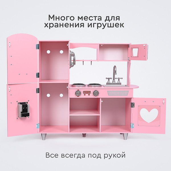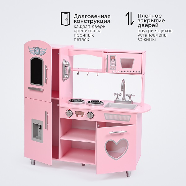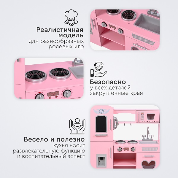 Кухня изготовлена из дерева - экологически чистого материала. Собирается легко с помощью поэтапной подробной инструкции (понадобится только крестовая отвертка). Все углы кухни закруглены для безопасности детей во время игры.