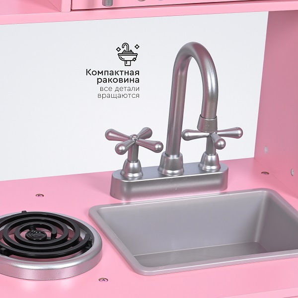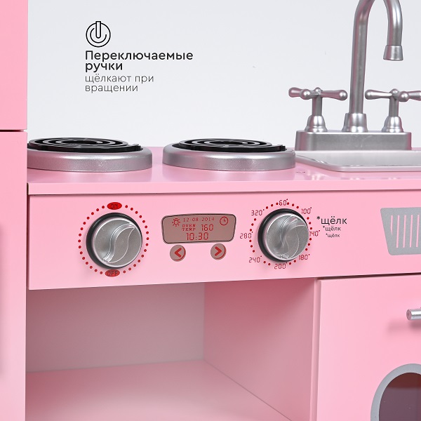 Детская кухня Tomix Sabrina (томикс сабрина) - Детская игровая кухня Сабрина непременно приведёт в восторг юного кулинара! Розовая кухня с элементами, стилизованными под серебро станет украшением детской комнаты! В ней есть все для реалистичной игры: духовой шкаф с двумя полками для разных блюд и щелкающими переключателями, варочная поверхность с двумя конфорками, компактная раковина с вращающимися элементами, встроенный холодильник со звуковым эффектом, шкафчик для хранения посуды и даже микроволновая печь!