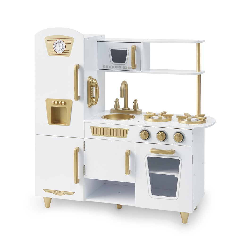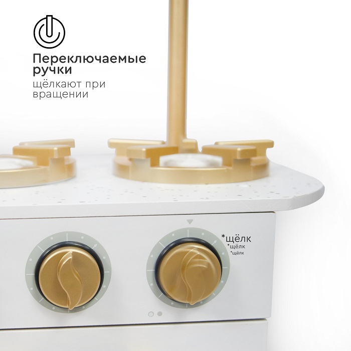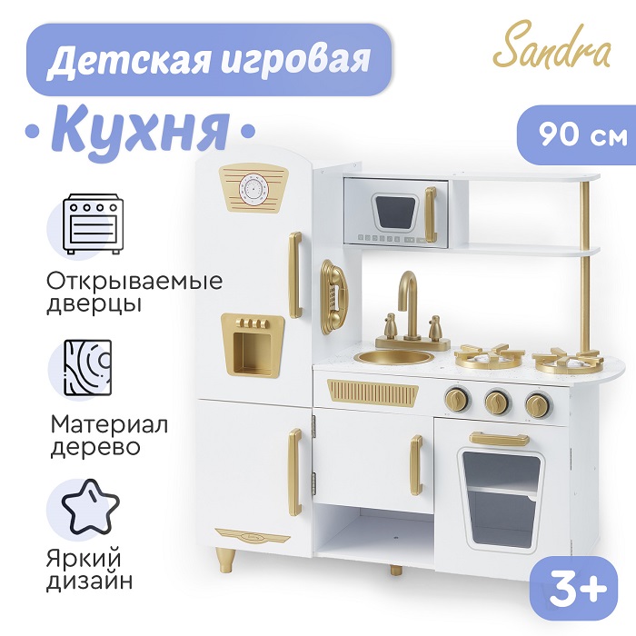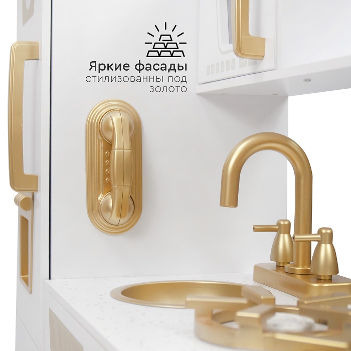 Детская кухня Tomix Sandra (Томикс Сандра) - игровая детская кухня приведет в восторг любого ребенка! Светлая кухня с элементами, стилизованными под золото, станет украшением детской комнаты! В ней есть все для реалистичной игры: духовой шкаф с двумя полками для разных блюд и щелкающими переключателями, варочная поверхность с двумя конфорками, компактная раковина с вращающимися элементами, встроенный холодильник, шкафчик для хранения посуды и даже микроволновая печь!