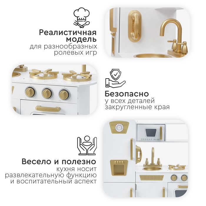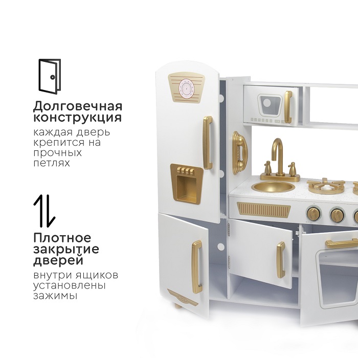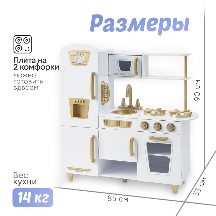 Кухня изготовлена из дерева - экологически чистого материала. Собирается легко с помощью поэтапной подробной инструкции (понадобится только крестовая отвертка). Все углы кухни закруглены для безопасности детей во время игры.