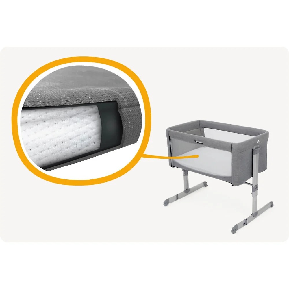 Детская колыбель Joie Roomie (Джои руми) - детская приставная кроватка для ребенка с рождения до 9 кг, примерно до 6 месяцев. Это легкая, мобильная детская кровать с просторным спальным местом и качественным толстым упругим матрасиком. Боковины кроватки выполнены из сетчатого материала, что позволит наблюдать за ребенком с любой части комнаты, а так же улучшать циркуляцию в детской кроватке. Весь текстиль непромокаемый и легко чистится, а наматрасник снимается для стирки.
