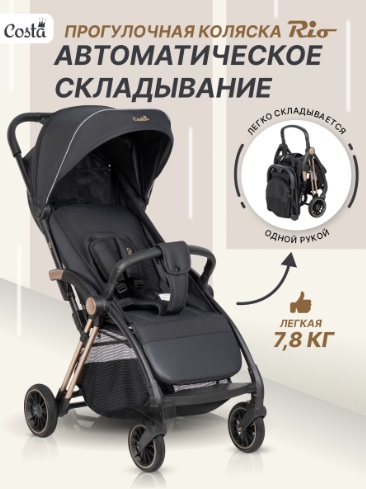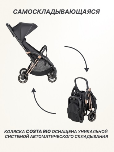- Коляска Costa Rio оснащена уникальной системой автоматического складывания одной рукой, что позволяет легко и быстро подготовить коляску к транспортировке.
