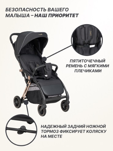 - Безопасность вашего малыша – наш приоритет. Коляска оборудована пятиточечными ремнями с мягкими плечевыми накладками и центральным замком, а также тканевым разделителем для ножек. Отстегивающийся бампер безопасности с обеих сторон обеспечивает дополнительную защиту. Надежный задний ножной тормоз фиксирует коляску на месте, обеспечивая безопасность во время остановок.