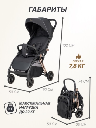 - Габариты коляски 90х50х102 см, в сложенном виде 30х50х74 см.