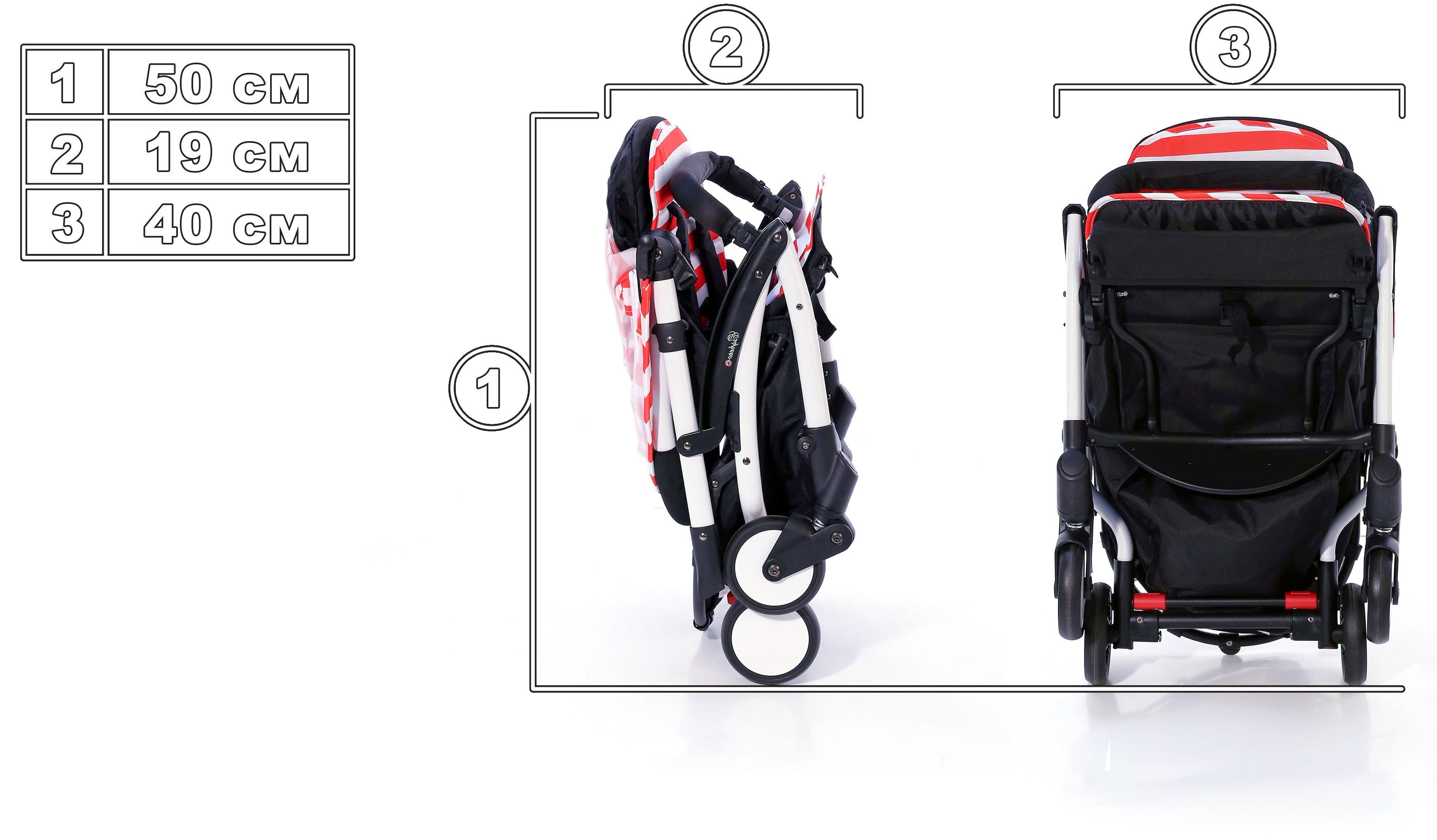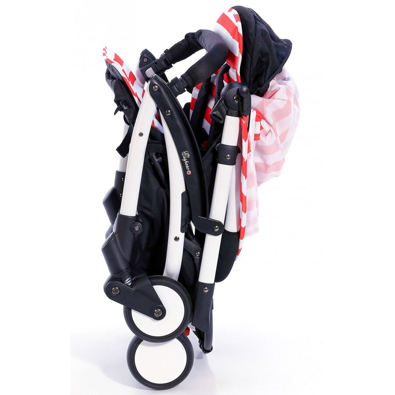 Механизм складывания происходит путем откидывания капюшона на спинку с последующим сложением коляски "книжкой", за счет чего коляска в полном сложенном состоянии приобретает минимальные размеры, всего 500*400 мм, что является абсолютным достоинством при транспортировках, в путешествиях и при хранении!