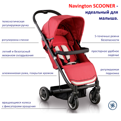 Детская коляска Navington Scooner (навингтон скунер) – прогулочная коляска с большим и широким сидением и компактным сложением. Она воплощает в себе все требования современных родителей к хорошей прогулочной коляске. Самое главное, конечно, большое и широкое спальное место с полностью опускающей спинкой, где бы вы не находились у ребенка будет комфортное место для сна. Большой капюшон с дополнительным козырьком от солнца закроет кроху от небольшого дождя, солнышка, или от яркого света в помещениях. Качественные ткани в красивых классических расцветках не выцветают со временем, а ребенку будет комфортно. Легкий вес и компактное сложение позволит с легкостью собирать коляску даже, если мама путешествует одна.