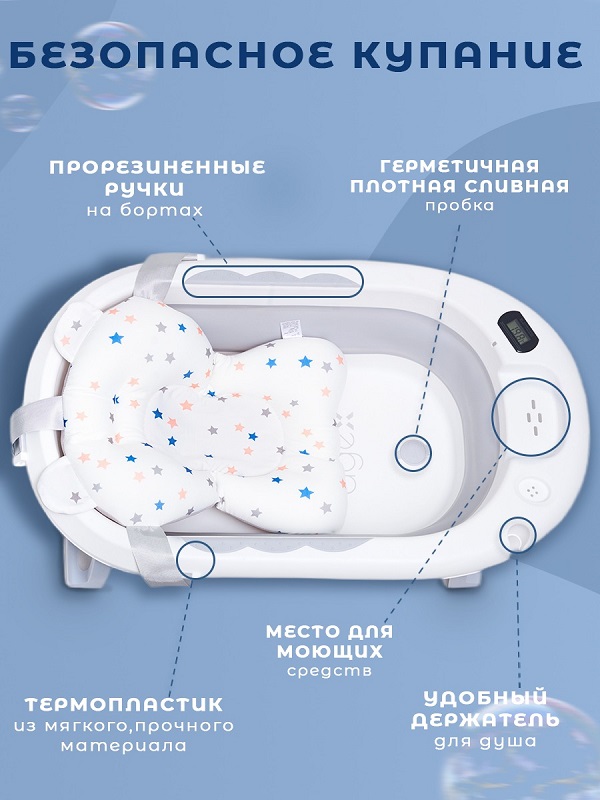 - Встроенный термометр - контролируйте температуру воды во время купания, обеспечивая комфорт и безопасность для вашего малыша
