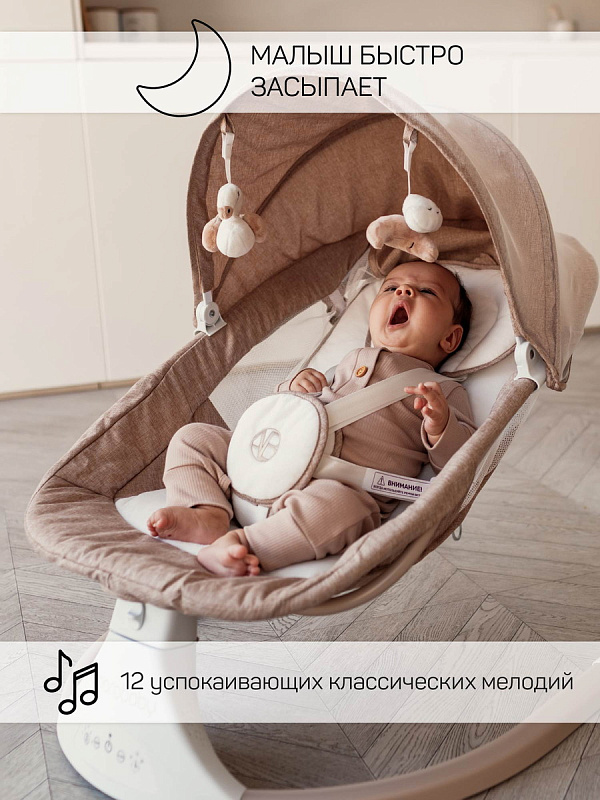 Приятные мелодии из 12 предложенных вариантов, создадут вашему малышу спокойную и уютную атмосферу. А с помощью функции Bluetooth вы сможете поставить любую детскую песенку, которая по душе вашему малышу. Ремни безопасности надежно удерживают ребенка в качелях, обеспечивая ему безопасность и комфорт. С помощью пульта, который идет в комплекте, вы легко и просто сможете управлять электрокачелями.