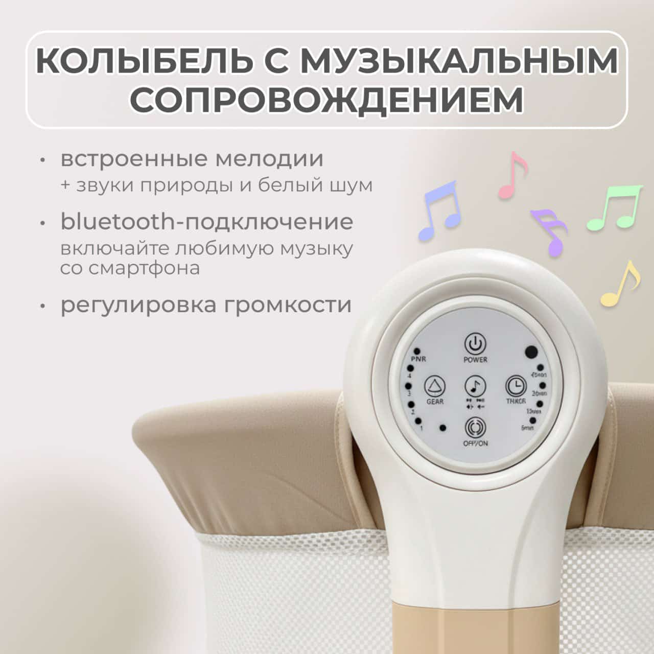 • Режим автоматического укачивания: когда малыш шевелится или начинает плакать, колыбель сама начинает раскачиваться, а когда ребёнок засыпает — автоматически останавливается.