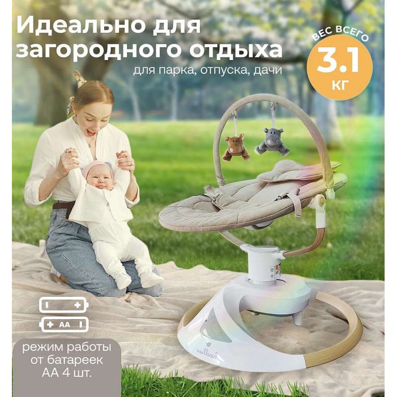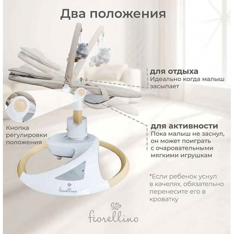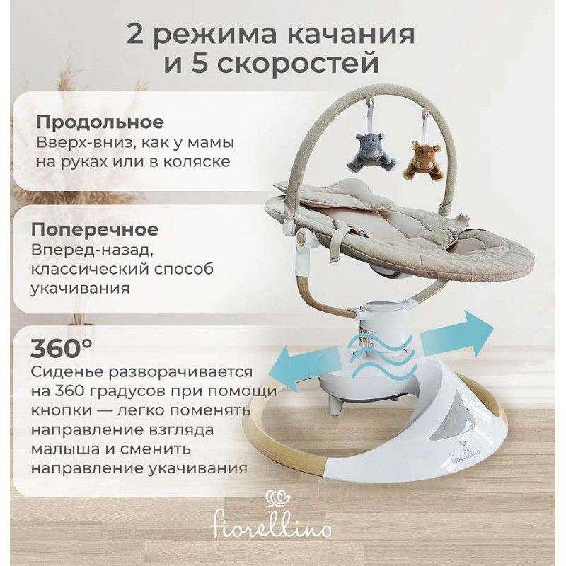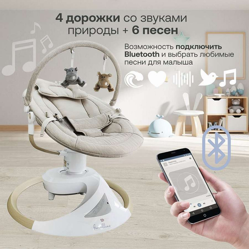 Детские качели Fiorellino beige BSN003 - электронные качели которые созданы именно для маминого отдыха! Пока малыш наблюдает за подвесными игрушками под плавные покачивания и приятную музыку, у вас есть возможность выпить чашечку чаю, почитать любимую книгу или неспешно позавтракать.