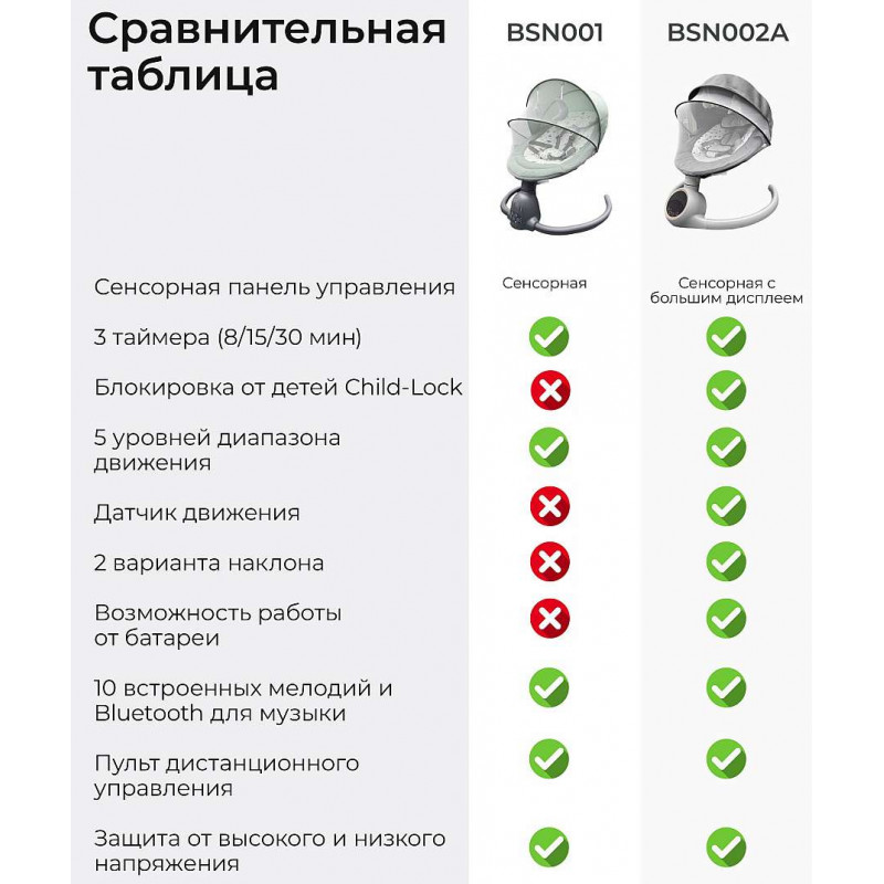 Пользоваться качелями очень просто: они оснащены интуитивно понятной сенсорной панелью, а также есть пульт дистанционного управления. Вы можете менять режим качания, громкость или мелодии. Также предусмотрен таймер на 8, 15 или 30 минут.