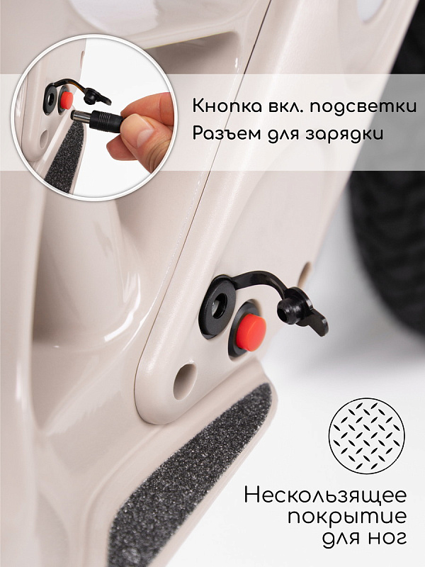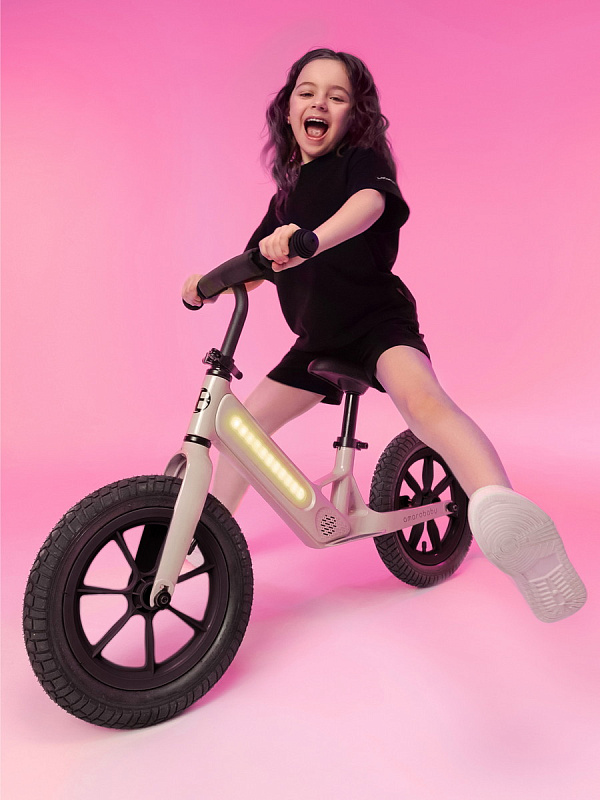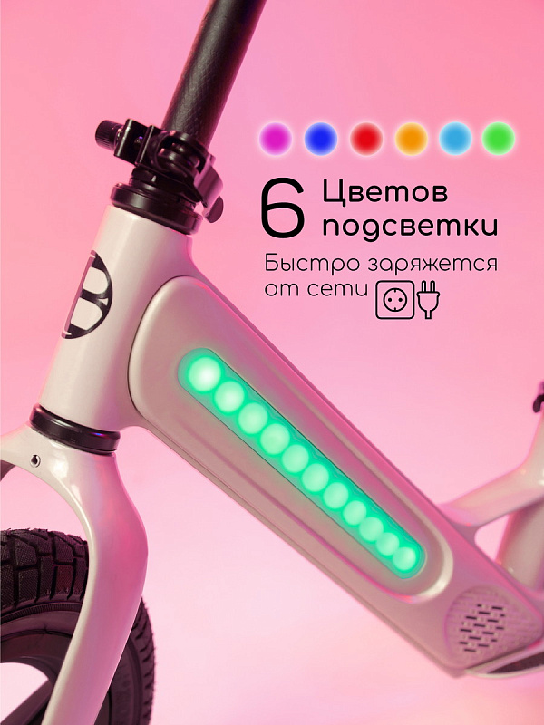 - LED подсветка, которая попеременно меняет цвета. Включается с кнопки и делает беговел невероятно красивым и ярким. В вечернее время смотрится очень эффектно. Заряжается этот велобег от обычной розетки, что делает его использование еще более удобным.