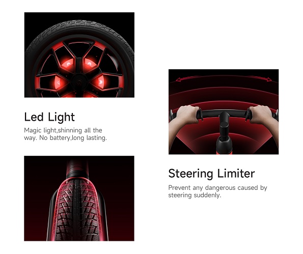- Яркая LED подсветка на заднем и переднем колесах сделает катание более интересным, а ребенка более видимым в темное время суток (работает во время движения)