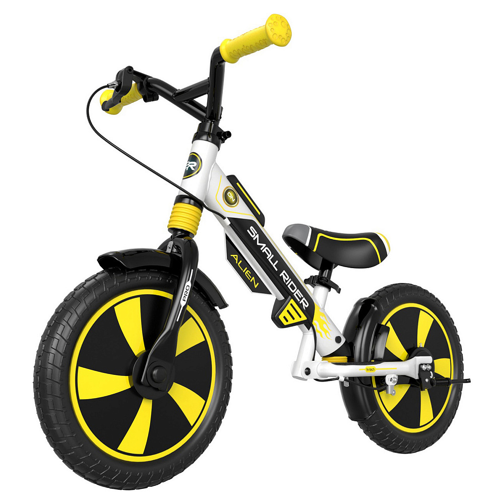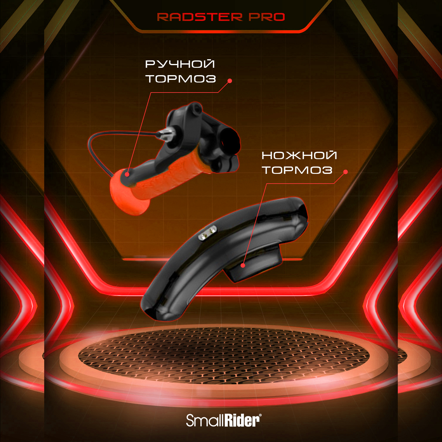 Беговел оснащен двумя тормозами: привычный- ручной тормоз, и ножной тормоз - приводится в действие при помощи нажатия на "крылышки" заднего брызговика, в результате чего внутренняя пластина брызговика соприкасается с колесом и тормозит его. Ножной тормоз это уникальная разработка компании Small Rider - детям очень нравится такой способ торможения, он простой, удобный, понятный.