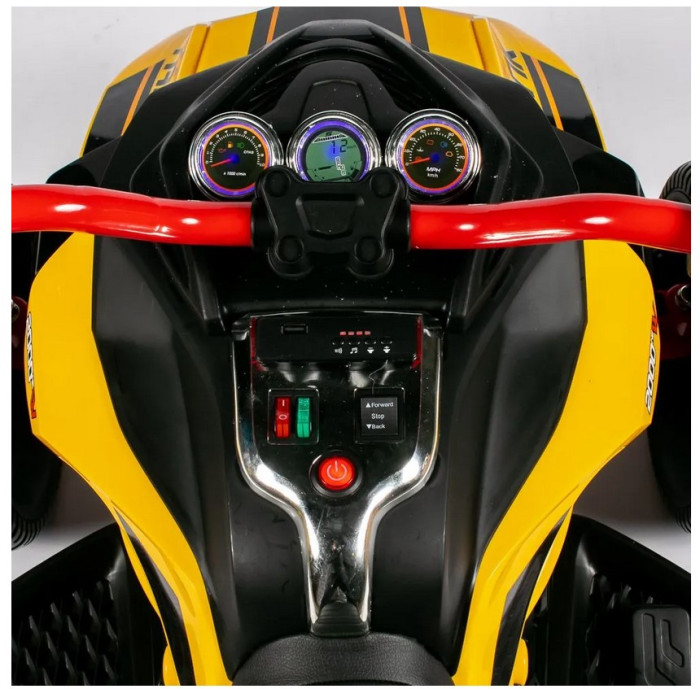 Машинкой может управлять сам ребенок, или, пока ребенок маленький и не разобрался с машинкой, родители с помощью пульта управления. Трицикл может ехать вперед и назад. Максимальная скорость равна 7 км/ч. При условии полной зарядки аккумуляторной батареи, можно кататься на протяжении 90-120 минут. Электромотоцикл оборудован музыкально-световым функционалом, что сделает поездки еще более интересными. На панели расположено несколько слотов для различных карт памяти.