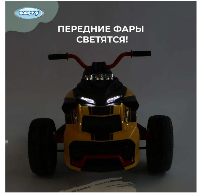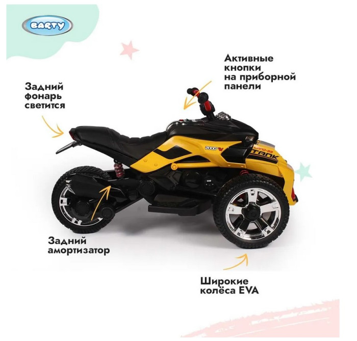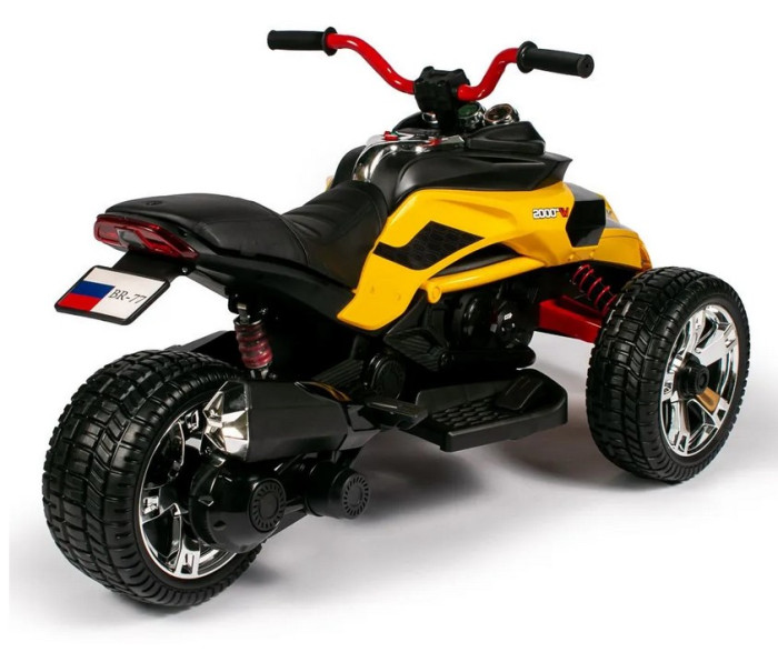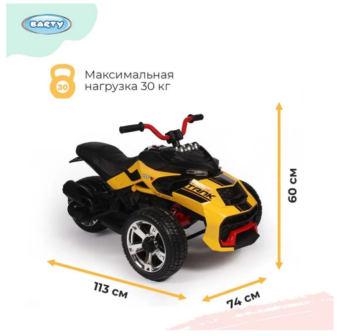 Электротрицикл Barty BR-77 (барти) - детский двухместный транспорт для ребенка от 3 до 8 лет, с максимальной нагрузкой 30 кг. Barty BR-77 это мощная машина с двумя моторами, большими передними колесами Eva и одним устойчивым задним колесом. Смесь машины и мотоцикла делает этот транспорт уникальным, привлекая внимание как детей так и взрослых. Машина невероятно устойчива и может ездить не только по асфальту, но и по бездорожью, а значит, прекрасный вариант для деревни, дачи, загородного дома. Такая машина не только разовьет внимание ребенка, но и сделает прогулки более длительными , приятными, с массой положительных впечатлений.