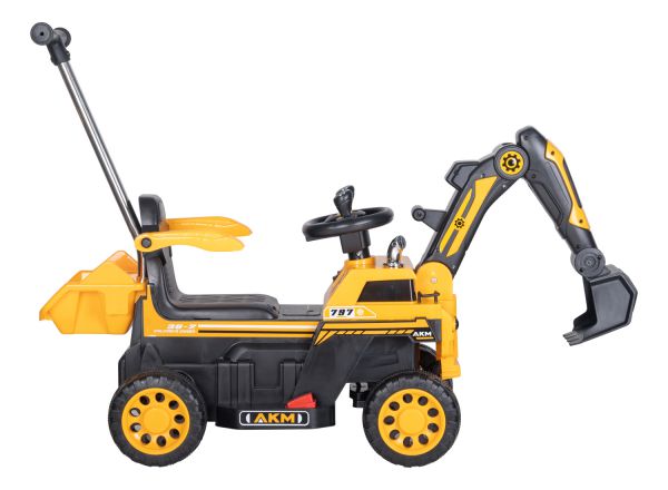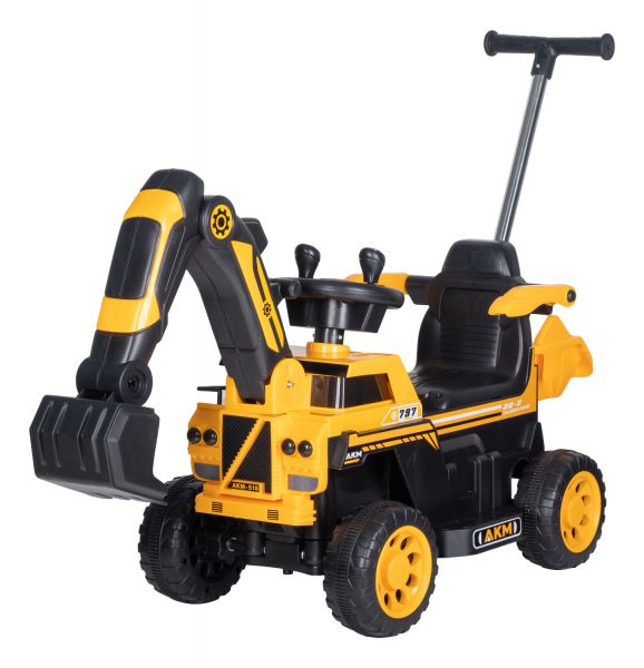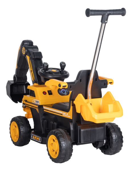 Детский экскаватор Farfello JT014 (Фарфелло) - предназначен для малышей, именно поэтому данная модель имеет родительскую ручку, что очень удобно. Мама может контролировать движение, и использовать машинку как толкатель, без запуска мотора. Сидение электромобиля имеет съемные ограничители, которые обезопасят ребёнка во время движения. Сам электромобиль запускается кнопкой, в движение машинку приводит нажатие педали газа. Переключение скоростей с помощью кнопки. На руле расположена кнопка для воспроизведения музыки и световых эффектов. Ковш поднимается с помощью рычагов на руле.