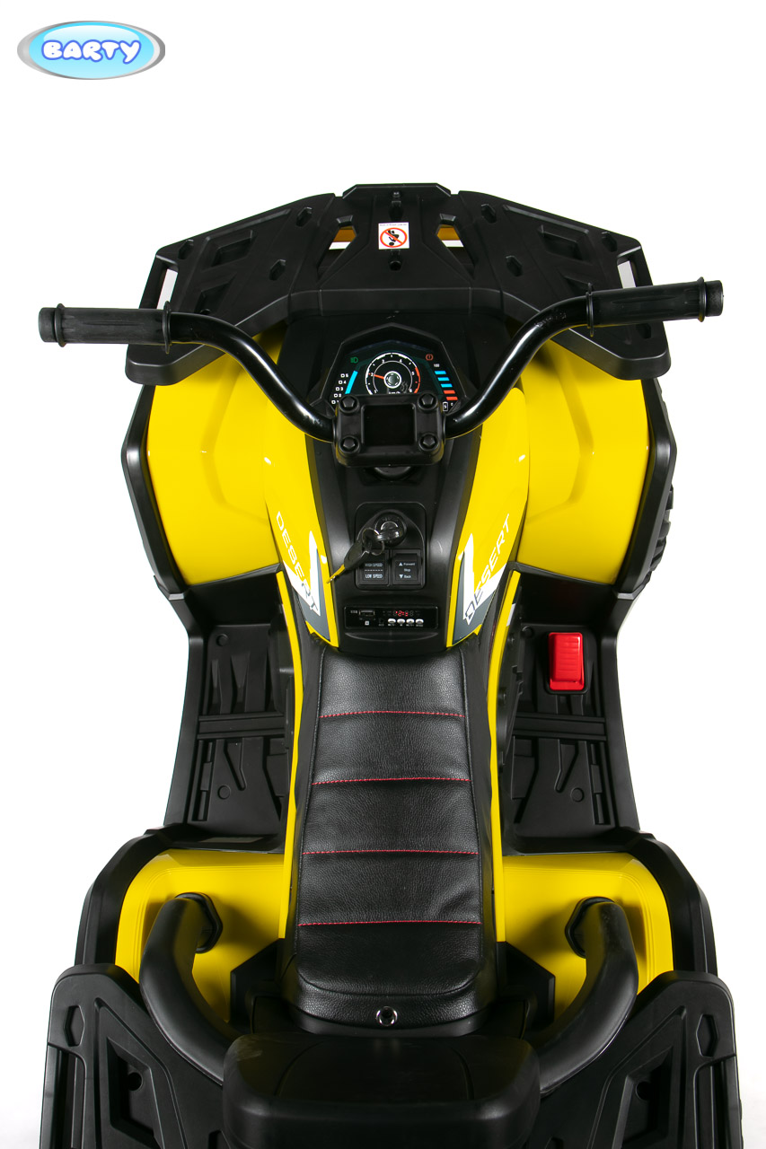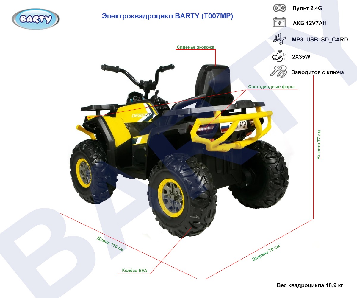 Квадроцикл Barty T007MP (Барти Т007МР) - мощный транспорт для ребенка от 2 до 6 лет, который превратит любую прогулку в увлекательное приключение. Внушительный размеры, огромные резиновые колеса с амортизаторами и оригинальный дизайн, несомненно, понравится не только ребенку, но и любому взрослому. Сочетание мощного мотора и качественных колес позволит кататься как в городе, так и за городом.