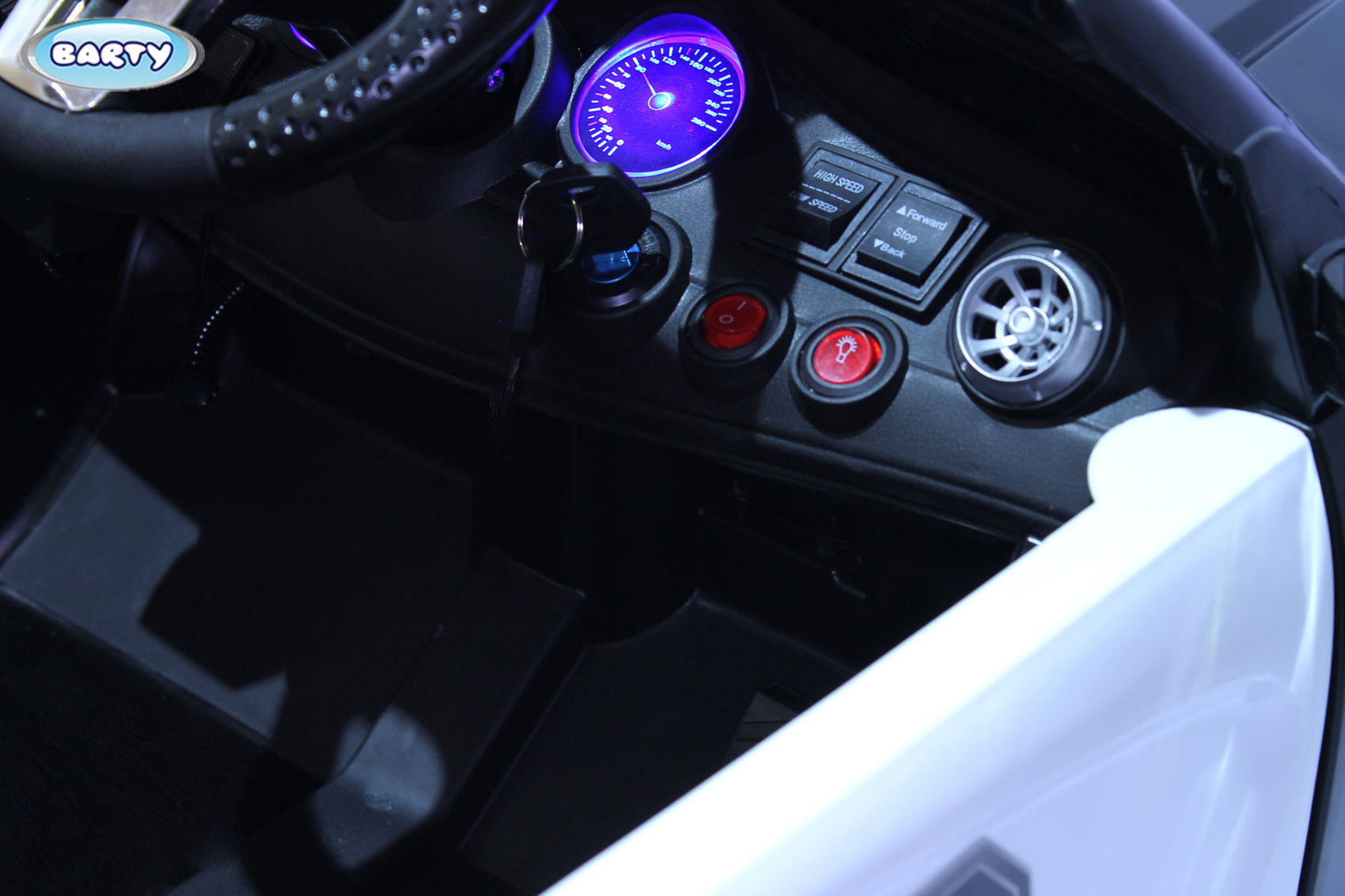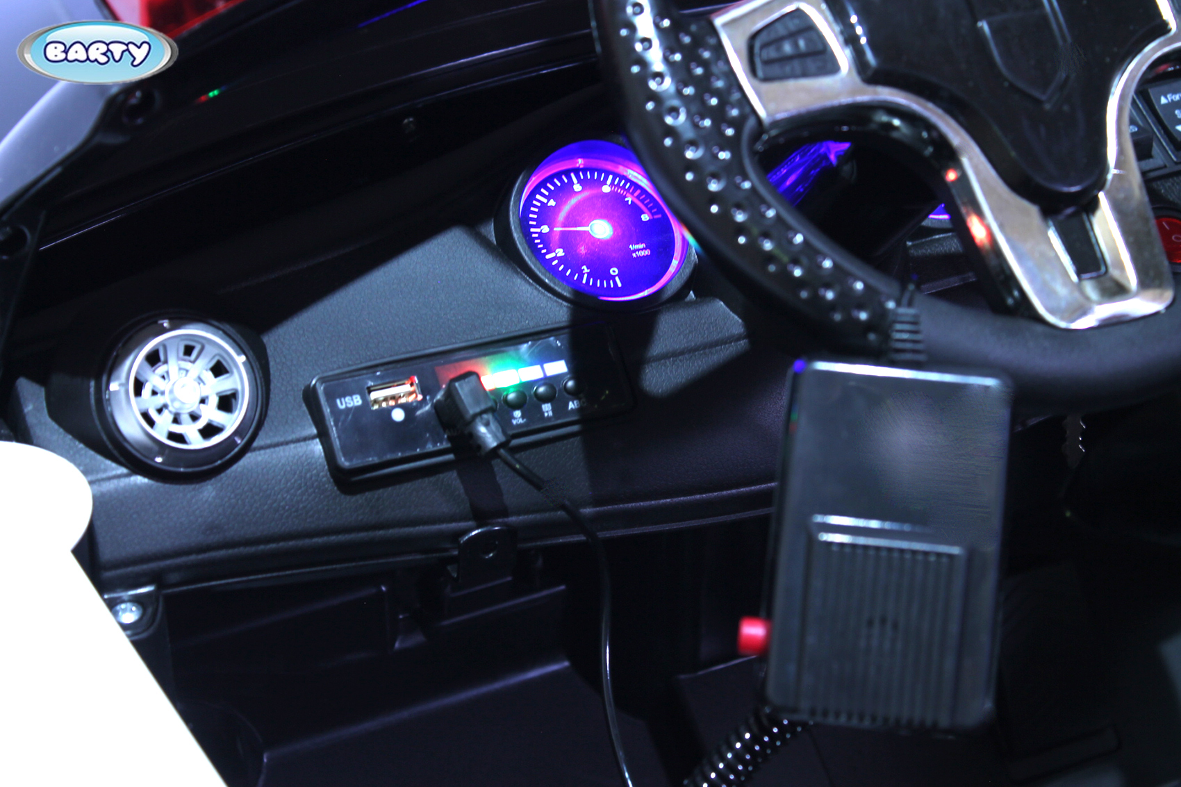 В салоне есть удобный руль со звуковыми эффектами. Помимо веселой встроенной музыки ребенок сможет прослушивать и другие мелодии. Воспроизвести их можно с помощью аудиомагнитолы на приборной панели.