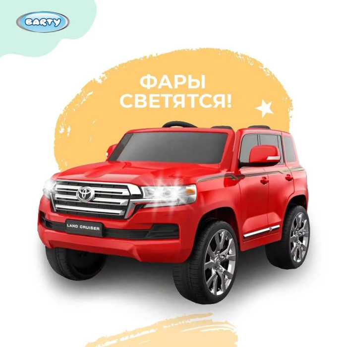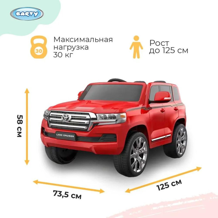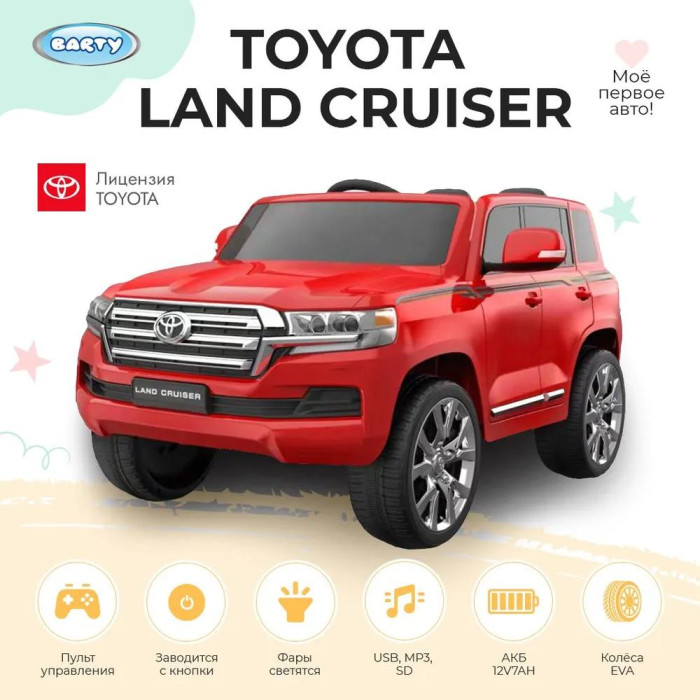 Детский электромобиль Barty TOYOTA LAND CRUISER (Барти тойота ленд круизер) - мощный внедоржник выполненный по лицензии от компании TOYOTA. Электромобиль подойдет для ребенка от 1 до 6 лет и станет надежным спутником на прогулках. Большие колеса EVA оснащены амортизаторами для более мягкого прохождения препятствий на своем пути. Мобиль заводится с кнопки, и оснащен световыми и звуковыми эффектами для максимальной приближенности к настоящему автомобилю.