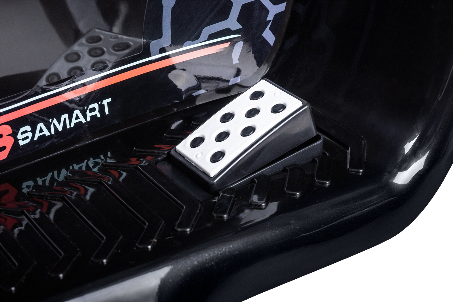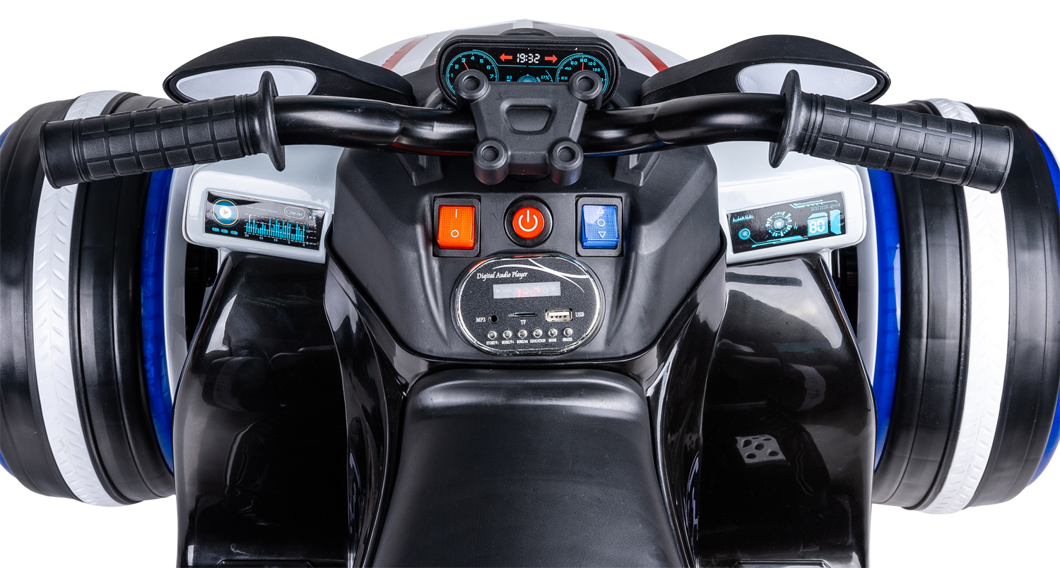 - На приборной панели расположена автомагнитола с индикатором заряда батареи, USB-вход, MP3. Звуковые эффекты: заводские мелодии, звук клаксона, функция раннего обучения (на английском языке).