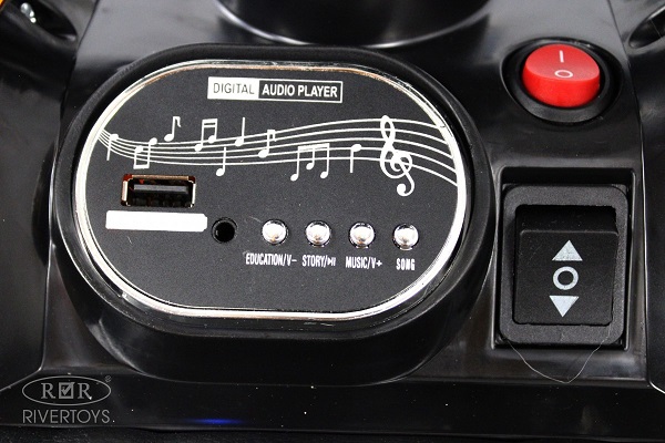 Сама машинка устойчивая и имеет простое управление. Заводится машинка с кнопки, а скорость вперед/назад регулируется педалькой. Для безопасности крохи предусмотрены специальные ограничители по бокам. Панель управления достаточно простая: есть заводская музыка, USB порт для флешки с музыкой или сказками.